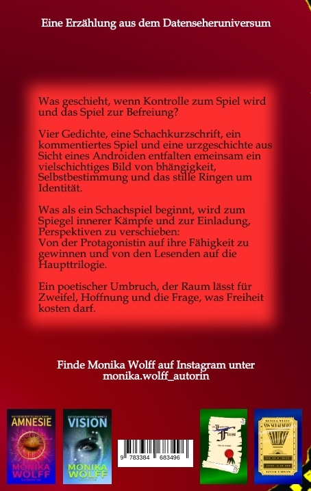 Diese Gedicht- und Kurzgeschichtensammlung ist in der dystopischen Welt der Datenseherin angesiedelt. Was geschieht, wenn Kontrolle zum Spiel wird und das Spiel zur Befreiung? Vier Gedichte, eine Schachkurzschrift, ein kommentiertes Spiel und eine Kurzgeschichte aus Sicht eines Androiden entfalten gemeinsam ein vielschichtiges Bild von Abhängigkeit, Selbstbestimmung und das stille Ringen um Identität.