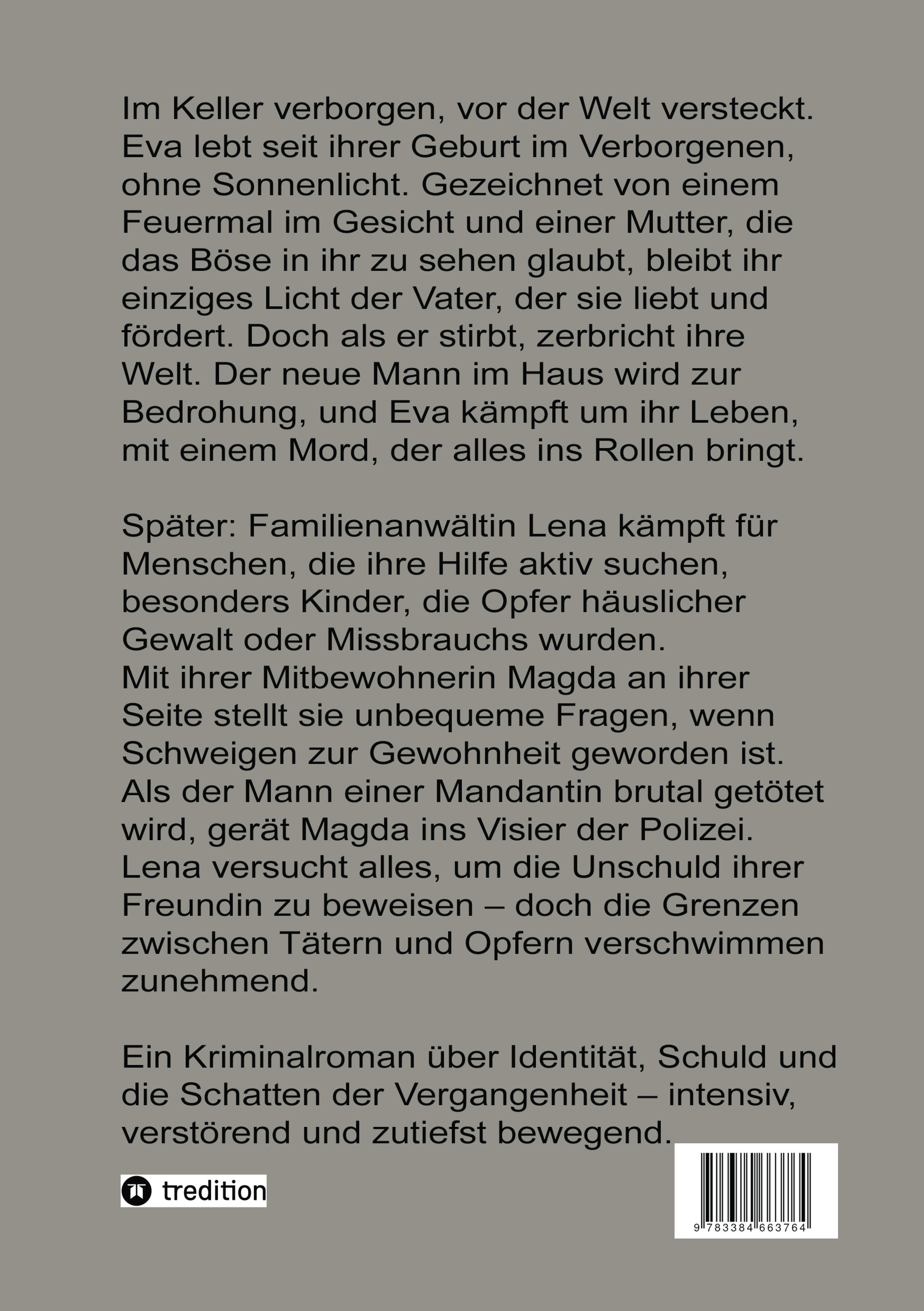 Eva wächst abgeschottet von der Welt auf - in einem Keller, fern vom Tageslicht, begleitet von Schuldzuweisungen und düsteren Glaubenssätzen. Ihre Kindheit ist ein fragiles Konstrukt aus Bildung, Angst und dem einzigen Lichtblick: der Liebe ihres Vaters. Als dieser stirbt, verliert sie jeden Halt. Der neue Freund der Mutter wird zur Gefahr. Als er sie das zweite Mal vergewaltigt werden soll, rettet sie nur ein Mord, der ihre Gefangenschaft beendet. Eine Reise durch Institutionen, Erinnerungen und die Suche nach Zugehörigkeit beginnt. Parallel dazu wird die Geschichte einer erfolgreichen Anwältin erzählt.Lena ist eine engagierte Familienanwältin mit einem untrüglichen Gespür für Wahrheit - besonders dann, wenn sie zwischen Schweigen und Schuld verborgen liegt. Ihre Fälle führen sie in die dunkelsten Winkel familiärer Gewalt. Doch als der Mann einer Mandantin brutal ermordet wird, beginnt eine Suche nach Antworten, die sie näher an persönliche Abgründe bringt, als ihr lieb ist.