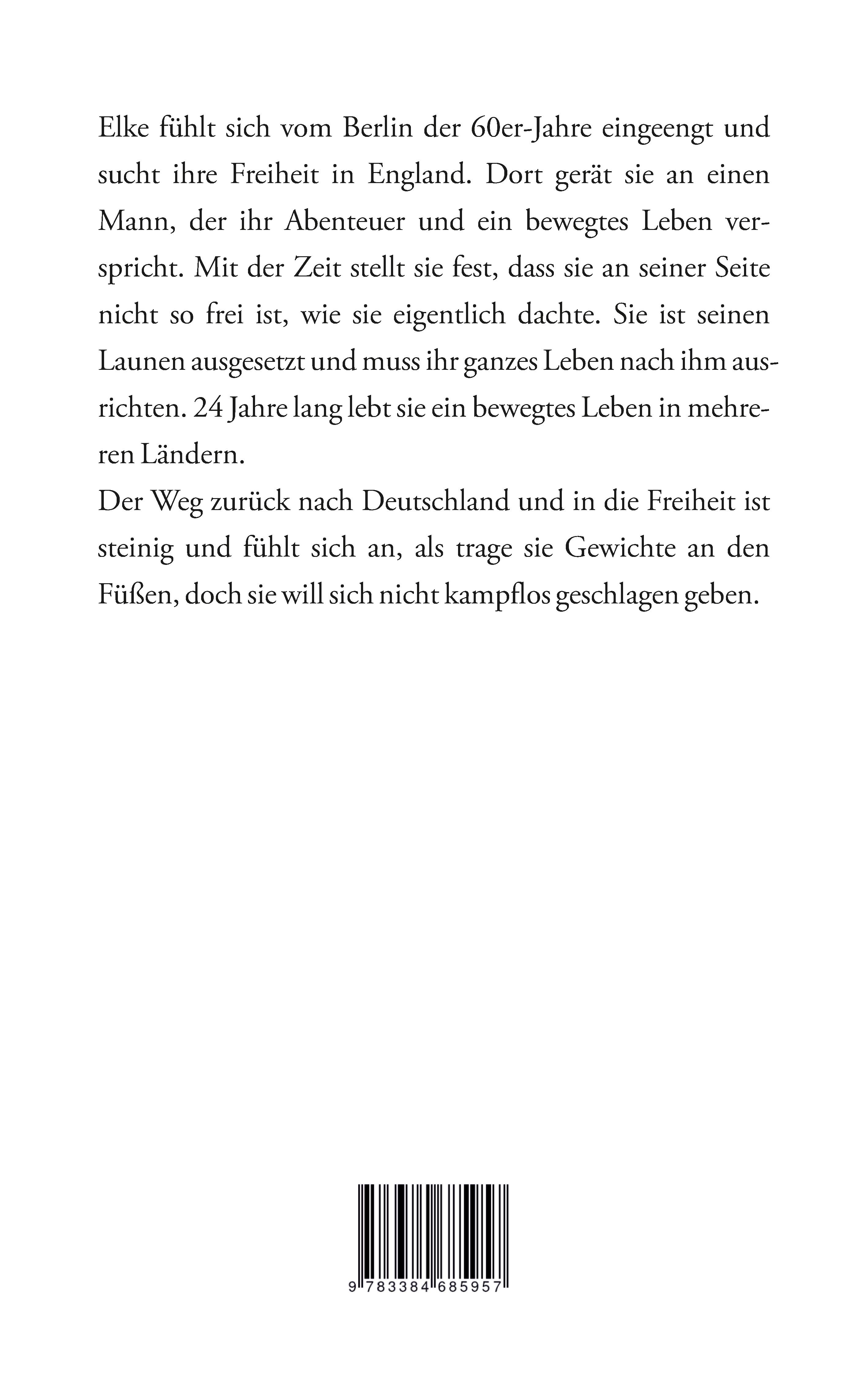 Elke fühlt sich vom Berlin der 60er-Jahre eingeengt und sucht ihre Freiheit in England. Dort gerät sie an einen Mann, der ihr Abenteuer und ein bewegtes Leben verspricht. Mit der Zeit stellt sie fest, dass sie an seiner Seite nicht so frei ist, wie sie eigentlich dachte. Sie ist seinen Launen ausgesetzt und muss ihr ganzes Leben nach ihm ausrichten. 24 Jahre lang lebt sie ein bewegtes Leben in mehreren Ländern. Der Weg zurück nach Deutschland und in die Freiheit ist steinig und fühlt sich an, als trage sie Gewichte an den Füßen, doch sie will sich nicht kampflos geschlagen geben.