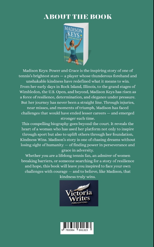 Madison Keys is more than a world-class athlete - she is a symbol of resilience, compassion, and the unshakable belief that dreams are worth chasing.In Madison Keys: Power and Grace, acclaimed biographer Janet V. Roberts traces the remarkable journey of a girl from Rock Island, Illinois, who dared to step onto the global stage of professional tennis at just fourteen years old. With a game built on explosive power and a personality rooted in humility, Madison quickly rose through the ranks, capturing the attention of fans and the respect of opponents.Yet her story is not just about trophies and scorelines. It is about setbacks and comebacks. Injuries that tested her resolve. Grand Slam finals that slipped away. The emotional weight of "almost" - and the extraordinary resilience it takes to keep going. Madison's career illuminates a truth far bigger than sport: greatness is not measured by flawless victories, but by how you rise after defeat.Beyond the baseline, Madison has become a role model who champions kindness as a force for change. Through her foundation, Kindness Wins, she has used her platform to uplift others, proving that true power lies in grace, compassion, and integrity.With vivid storytelling and deep insight, Roberts captures Madison's triumphs, struggles, and legacy in a way that speaks to both passionate tennis fans and anyone seeking inspiration to overcome challenges in their own life.Madison Keys: Power and Grace is a story of courage, determination, and heart - the portrait of an athlete who has redefined what it means to win.