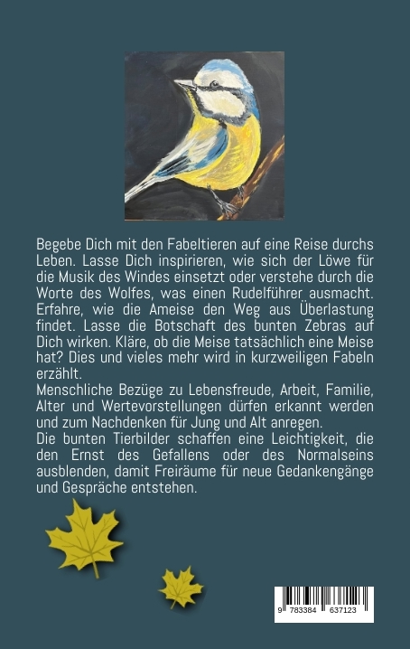 Reise mit den Fabeltieren zu Situationen, die das Leben auch für uns Menscchen bereithalten kann. Lasse Dich inspirieren, wie sich der Löwe für die Musik des Windes einsetzt oder verstehe durch die Worte des Wolfes, was einen guten Rudelführer ausmacht. Erfahre, wie die Ameise des Weg aus Überlastung findet. Lasse die Botschaft des bunten Zebras auf Dich wirken. Kläre, ob die Meise tatsächlich eine Meise hat? Dies und vieles mehr wird in kurzweiligen Fabeln erzählt.Menschliche Bezüge zu Lebensfreude, Arbeit, Familie, Alter und Wertvorstellungen dürfen erkannt werden und zum Nachdenken für Jung und Alt anregen. Die bunten Tierbilder schaffen eine Leichtigkeit, die den Ernst des Gefallens oder des Normalseins ausblenden, damit Freiräume für neue Gedankengänge und Gespräche entstehen.Dieses Buch beinhaltet moderne Fabeln, die zu mehr Wertschätzung, Empathie und Lebensfreude anregen. Es ist ideal als Geschenkbuch, um anderen eine tiefgründige Freude über das Leben zu machen oder sich selbst mit Werten oder Wertvorstellungen auseinanderzusetzen. Für Jung und Alt geeignet.