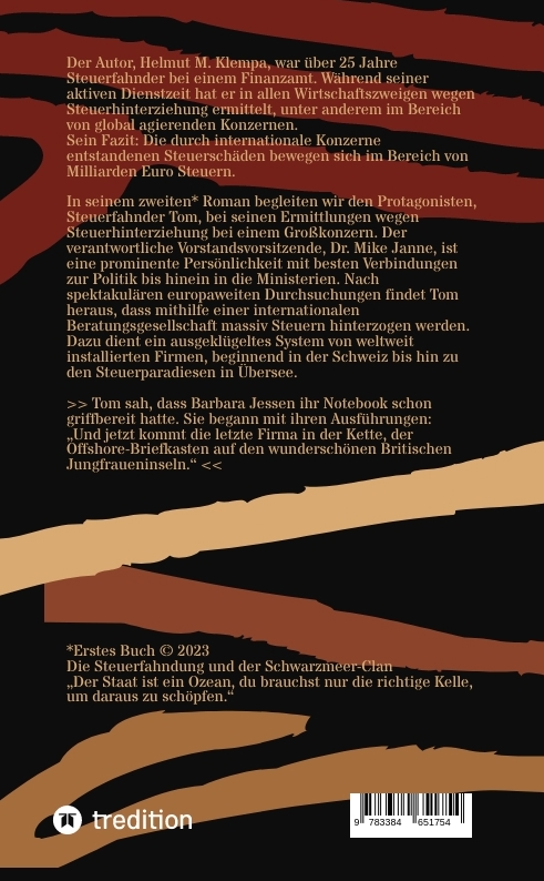 Die Steuerfahndung und der Konzern: "Im Visier: Milliardengewinne in den Steueroasen!"Im Roman begleiten wir den Protagonisten, Steuerfahnder Tom, bei seinen Ermittlungen wegen des Verdachts der Steuerhinterziehung gegen den verantwortlichen Vorstandvorsitzenden eines Konzerns, Dr. Mike Janne. Dieser ist eine prominente Persönlichkeit mit besten Verbindungen zur Politik bis hinein in die Ministerien. Nach spektakulären europaweiten Durchsuchungen findet Tom heraus, dass Dr. Janne - mithilfe einer international agierenden Beratungsgesellschaft - in Deutschland massiv Steuern hinterzieht. Dazu dient ein ausgeklügeltes System von weltweit installierten Firmen, beginnend in der Schweiz bis hin zu den Steuerparadiesen in Übersee.Der Buchautor war über 25 Jahre Steuerfahnder bei einem Finanzamt. Dabei war er insbesondere als Leiter von Ermittlungsgruppen tätig. Er schildert in seinem zweiten Buch - basierend auf Erlebnissen aus seinem Berufsleben - die steuerlichen, wirtschaftlichen und politischen Machenschaften eines global agierenden Konzerns. Der Autor zeigt dabei spannend und drastisch, aber auch unterhaltsam und humorvoll, die Auswirkungen von sogenannten "Steuervermeidungsstrategien" auf. Der Roman spielt im Bereich von Global Players, die letztendlich den Fiskus massiv schädigen und dafür selten zur Rechenschaft gezogen werden können."Die Steuerfahndung und der Konzern" ist der zweite Roman von Helmut M. Klempa. 2023 erschien sein Erstlingswerk mit dem Titel "Die Steuerfahndung und der Schwarzmeer-Clan", in dem wir den Protagonisten Tom bei der Ermittlung zu Schwarzgeschäften im Dienstleistungsgewerbe begleiten.