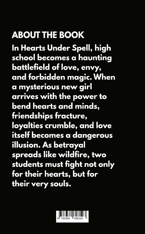 Hearts Under Spell is a YA Romantasy about love, betrayal, and the dangerous allure of power. It follows Lena, a brilliant and beautiful student, whose perfect relationship with Jason makes her the target of jealousy. When a mysterious new girl with the power to manipulate hearts arrives, Lena's world unravels-friendships are broken, loyalties tested, and her true love threatened. Caught between envy, betrayal, and supernatural forces, Lena must fight for her heart and discover the strength within herself to resist manipulation and reclaim her happiness.