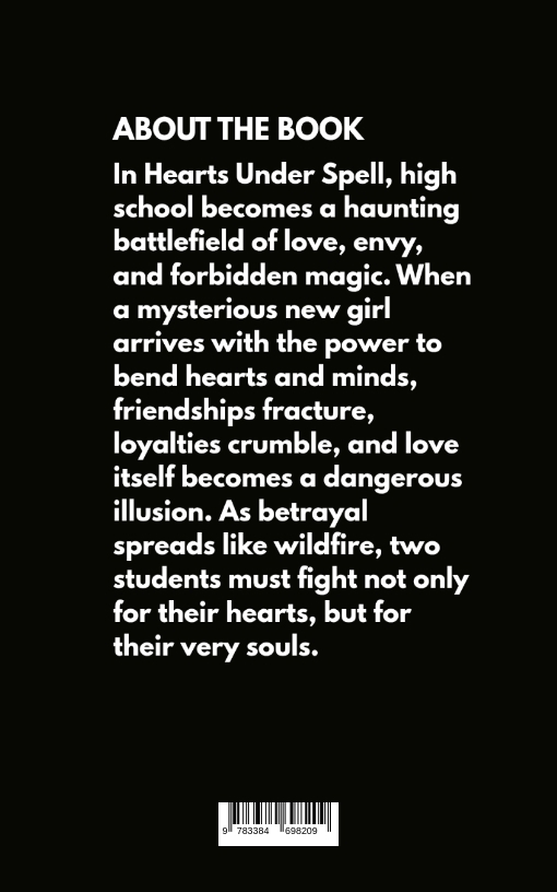 Hearts Under Spell is a YA Romantasy about love, betrayal, and the dangerous allure of power. It follows Lena, a brilliant and beautiful student, whose perfect relationship with Jason makes her the target of jealousy. When a mysterious new girl with the power to manipulate hearts arrives, Lena's world unravels-friendships are broken, loyalties tested, and her true love threatened. Caught between envy, betrayal, and supernatural forces, Lena must fight for her heart and discover the strength within herself to resist manipulation and reclaim her happiness.