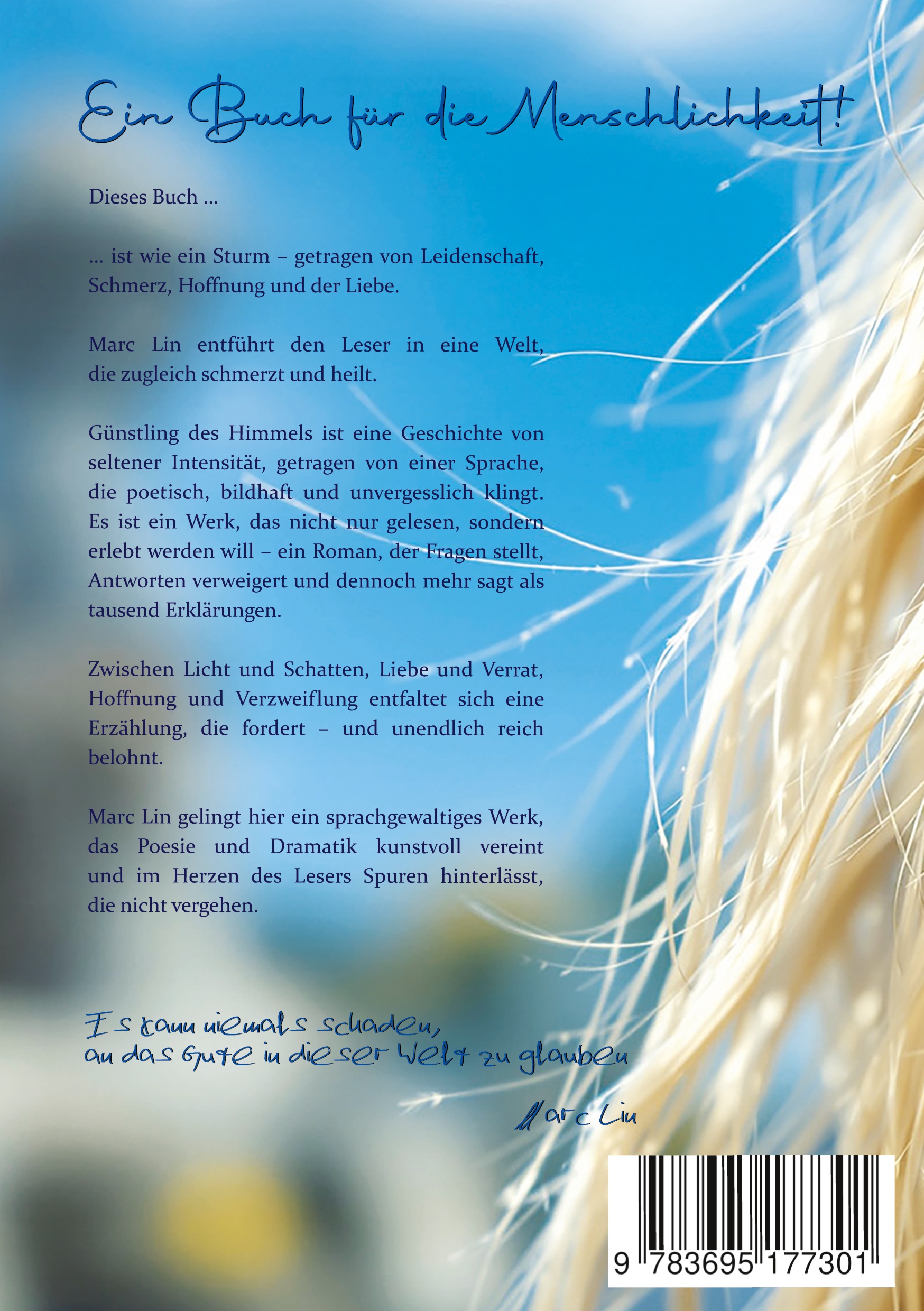 Marc Lin entführt den Leser in eine Welt, die gleichermassen schmerzt und heilt. Günstling des Himmels ist eine Geschichte von seltener Intensität, getragen von einer Sprache, die poetisch, bildhaft und unvergesslich ist. Es ist ein Werk, das nicht nur gelesen, sondern erlebt werden will. Ein Roman, der Fragen stellt, Antworten verweigert und dennoch mehr sagt als tausend Erklärungen.