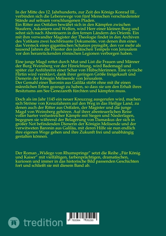 | Schlagworte | 2. Kreuzzug • Albrecht der Bär • Bernhard von Plötzkau • Geheimnisse des Vatikan • Kämpfe zwischen Staufern, Welfen und Askaniern • König Balduin III. von Jerusalem • Königin Melisende • König Konrad III. • Qumran • Schatzsuche • verschiedene Liebesbeziehungen • Weiber von Weinsberg |