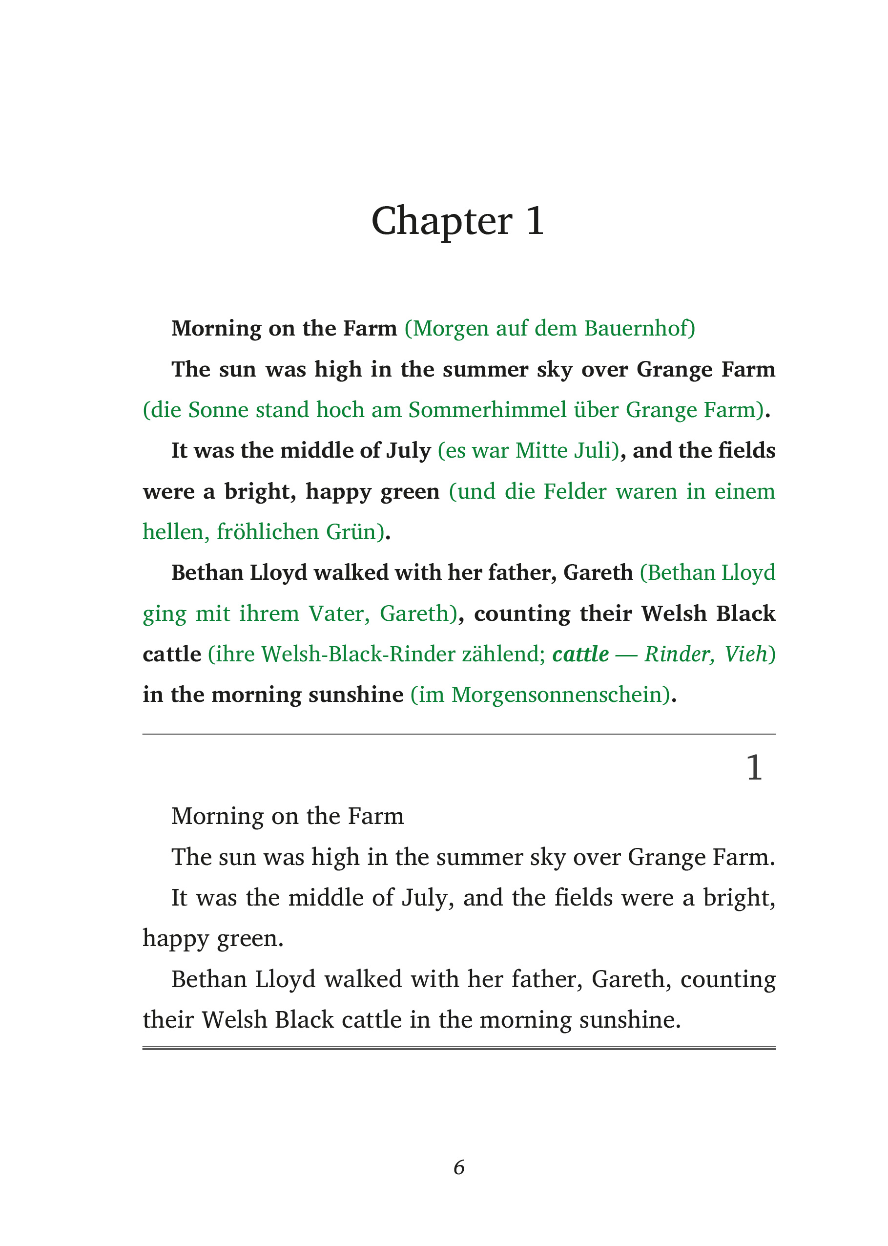 Leseprobe: https://easyoriginal.com/leseproben/DE89.pdf Englische Krimi-Lektüre für Anfänger (A1-A2) - Frank-Lesemethode mit erklärenden Einfügungen & Audio-DownloadTauchen Sie ein in einen Kriminalfall - und verbessern Sie dabei spielerisch Ihr Englisch!Diese spannende Kurzgeschichte ist Teil der beliebten Reihe für Sprachlernende und basiert auf der bewährten Frank-Lesemethode. Handlung: The Midnight Moo-ver - Der mitternächtliche AusreißerEin nächtliches Rätsel. Eine Farm in Aufruhr.Auf Grange Farm geschieht jede Nacht das Unmögliche: Dreißig Kühe verschwinden spurlos aus einem fest verriegelten Feld. Sie kehren bei Sonnenaufgang zurück, als wären sie durch Zäune marschiert - erschöpft, mit Spuren von seltsamem blauen Schlamm und mysteriöse Kreise im Gras hinterlassend. Die junge Farm-Detektivin Bethan Lloyd ist entschlossen, das Geheimnis zu lüften. Ihre nächtliche Jagd nach der Wahrheit enthüllt ein Rätsel, das tiefer und erstaunlicher ist als jede Legende. Tauchen Sie ein in das fesselnde Mysterium von The Midnight Moo-ver. Eine clevere Heldin und ein Geheimnis, das in der Geschichte des Landes verwurzelt ist, werden Sie bis zur letzten Seite nicht mehr loslassen. Was dieses Buch besonders macht Frank-Lesemethode: Deutsche Erklärungen und Hilfen sind direkt im englischenText integriert - ohne den Lesefluss zu unterbrechen Keine klassische Übersetzung, sondern kontextbasierte Unterstützung Originaltext auf B1-Niveau, aber vollständig lesbar für A1-A2 durch gezielte sprachliche Hilfen Inklusive Audio-Download für gezieltes Hörverständnis und Nachsprechen Vorteile für SprachlernendeZugang zu authentischem Englisch ab der ersten Seite - ohne ÜberforderungWortschatzaufbau im Kontext, nicht isoliertVerstärkung von Grammatik, Ausdruck und SprachgefühlIdeal für Selbstlerner, Wiedereinsteiger und motivierende Unterrichtslektüre Diese Geschichte ist Teil einer umfangreichen Reihe für Deutschsprachige, die mit echter Literatur und professioneller sprachlicher Begleitung Englisch lernen möchten. Audio inklusive. Mehr zur Methode: https://easyoriginal.com/frank-lesemethode/sern!