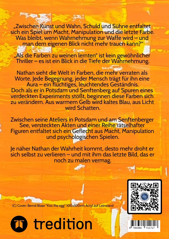 | Schlagworte | Farbwahrnehmung • Kunst als Waffe • Psychothriller, Synästhesie Farbwahrnehmung Manipulation Wahrheit & Lüge Kunst als Waffe Philosophie Psychologie Mikroexpressionen Wahn & Realität Geheimnisse Moralische Grauzonen Atmosphä • Psychothriller, Synästhesie Farbwahrnehmung Manipulation Wahrheit & Lüge Kunst als Waffe Philosophie Psychologie Mikroexpressionen Wahn & Realität Geheimnisse Moralische Grauzonen Atmosphärische Schauplätze (Potsdam, Dresden, Senftenberg) Innere Abgründe Wahrnehmungsexperimente Gefährliche Nähe • Synästhesie, • Wahrheit und Lüge, |