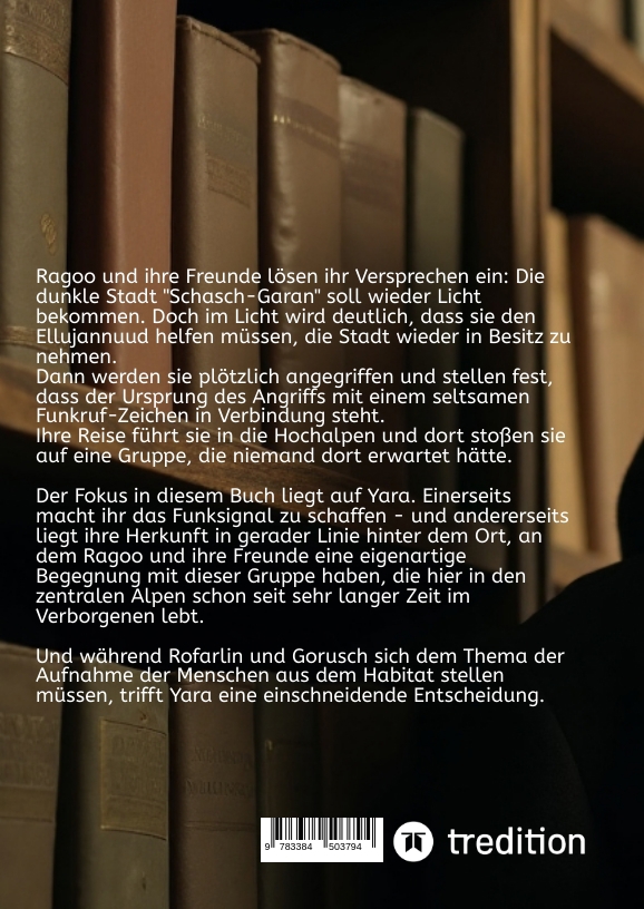 Ragoo und ihre Freunde lösen ihr Versprechen ein: Die dunkle Stadt "Schasch-Garan" soll wieder Licht bekommen. Doch im Licht wird deutlich, dass sie den Ellujannuud helfen müssen, die Stadt wieder in Besitz zu nehmen.Dann werden sie plötzlich angegriffen und stellen fest, dass der Ursprung des Angriffs mit einem seltsamen Funkruf-Zeichen in Verbindung steht. Ihre Reise führt sie in die Hochalpen und dort stoßen sie auf eine Gruppe, die niemand dort erwartet hätte.Der Fokus in diesem Buch liegt auf Yara. Einerseits macht ihr das Funksignal zu schaffen - und andererseits liegt ihre Herkunft in gerader Linie hinter dem Ort, an dem Ragoo und ihre Freunde eine eigenartige Begegnung mit dieser Gruppe haben, die hier in den zentralen Alpen schon seit sehr langer Zeit im Verborgenen lebt.Und während Rofarlin und Gorusch sich dem Thema der Aufnahme der Menschen aus dem Habitat stellen müssen, trifft Yara eine einschneidende Entscheidung.
