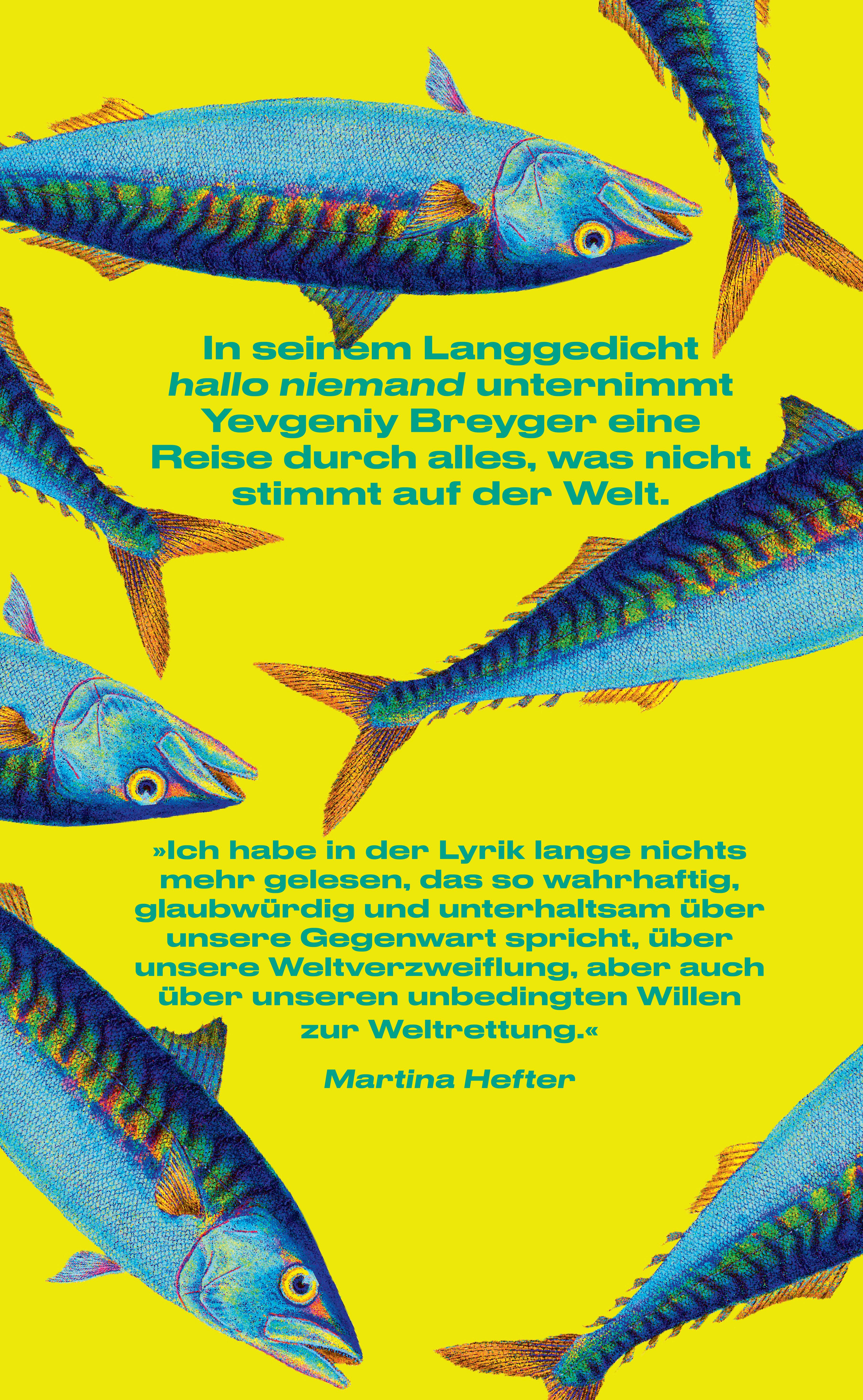 Yevgeniy Breygers erzählendes Langgedicht hallo niemand ist humorvolle Politsatire und zugleich ernsthafte Auseinandersetzung mit drängenden Fragen nach der Versehrtheit des Körpers und des Geistes in Zeiten von Krieg und totalitärer Realitätserzwingung. Die Stationen dieses Roadtrips fügen sich zu einem Panorama Deutschlands, und im Gegensatz zu Odysseus, der sich selbst Niemand nennt, um den Zyklopen zu überlisten, wird dem Helden dieser Reise der Name Niemand zugewiesen - ob er will oder nicht.