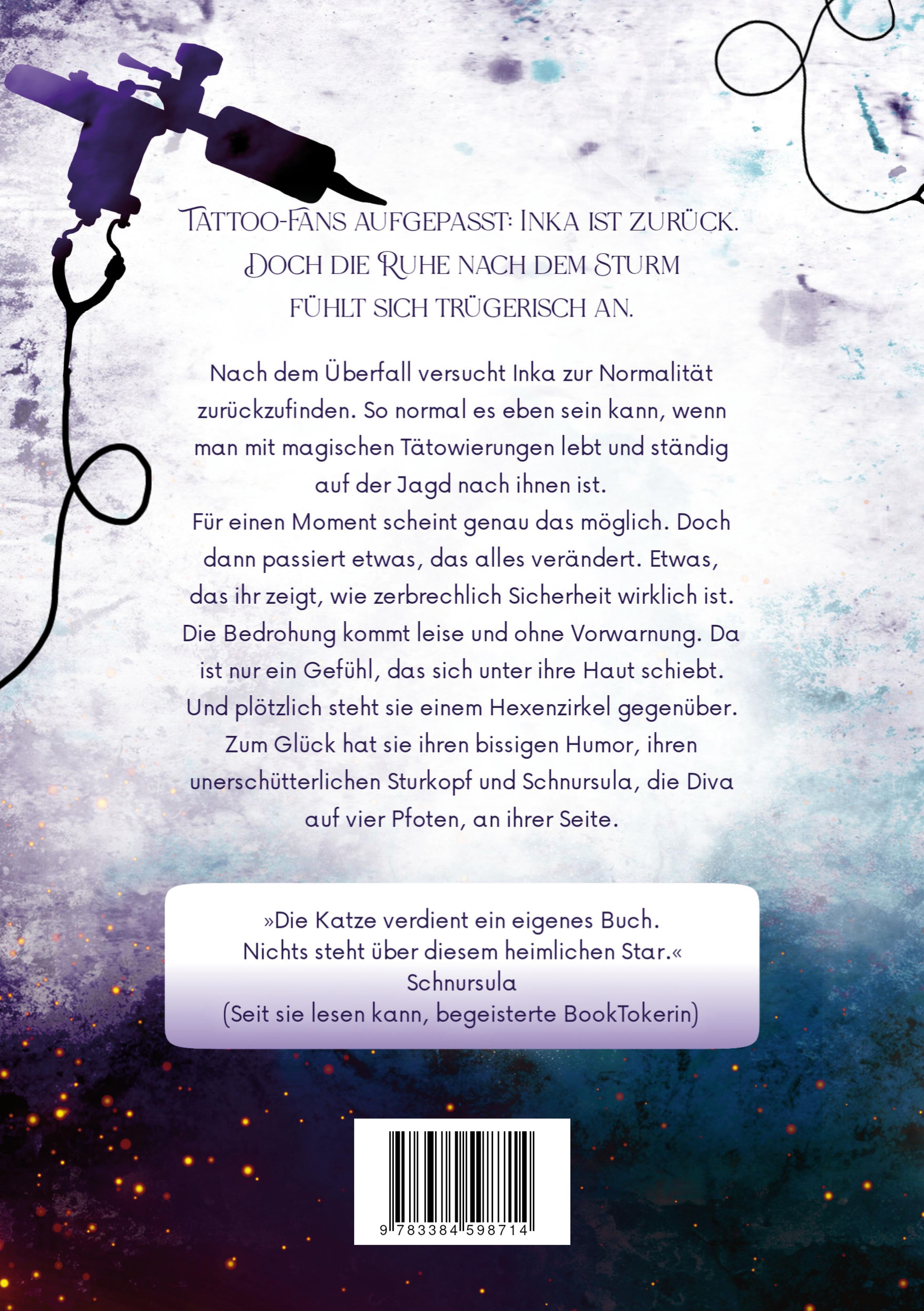 Tattoo-Fans aufgepasst: Inka ist zurück.Doch die Ruhe nach dem Sturm fühlt sich trügerisch an.Nach dem Überfall versucht Inka, zur Normalität zurückzufinden. So normal es eben sein kann, wenn man mit magischen Tätowierungen lebt und ständig auf der Jagd nach ihnen ist.Für einen Moment scheint genau das möglich. Doch dann passiert etwas, das alles verändert. Etwas, das ihr zeigt, wie zerbrechlich Sicherheit wirklich ist.Die Bedrohung kommt leise und ohne Vorwarnung. Da ist nur ein Gefühl, das sich unter ihre Haut schiebt. Und plötzlich steht sie einem Hexenzirkel gegenüber.Zum Glück hat sie ihren bissigen Humor, ihren unerschütterlichen Sturkopf und Schnursula, die Diva auf vier Pfoten, an ihrer Seite.