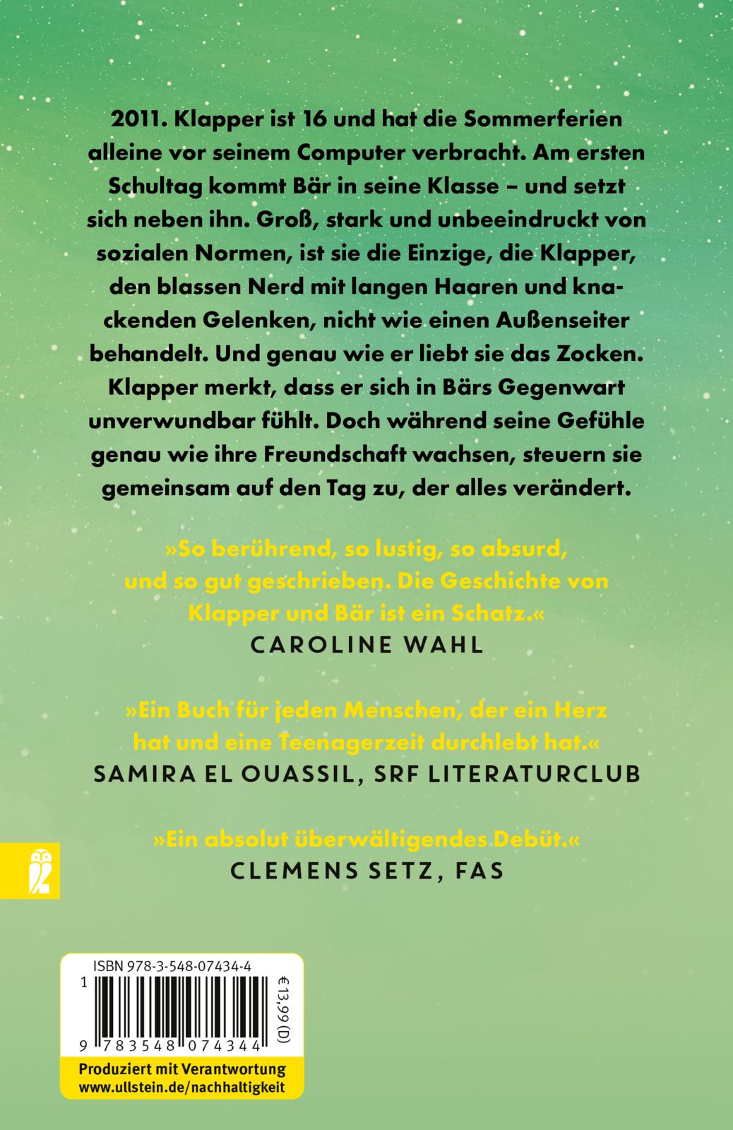 Sommer 2011. Klapper ist sechzehn und hat die Sommerferien alleine vor seinem Computer verbracht. Am ersten Schultag kommt plötzlich Bär in seine Klasse - und setzt sich neben ihn. Groß, stark und absolut unbeeindruckt von sozialen Normen, ist sie die Einzige, die Klapper, den blassen Nerd mit langen Haaren und knackenden Gelenken, nicht wie einen Außenseiter behandelt. Und genau wie er liebt sie das Zocken. Klapper merkt immer mehr, dass er sich in Bärs Gegenwart unverwundbar fühlt. Doch während seine Gefühle genau wie ihre Freundschaft wachsen, steuern sie gemeinsam auf den Tag zu, der alles ändert.