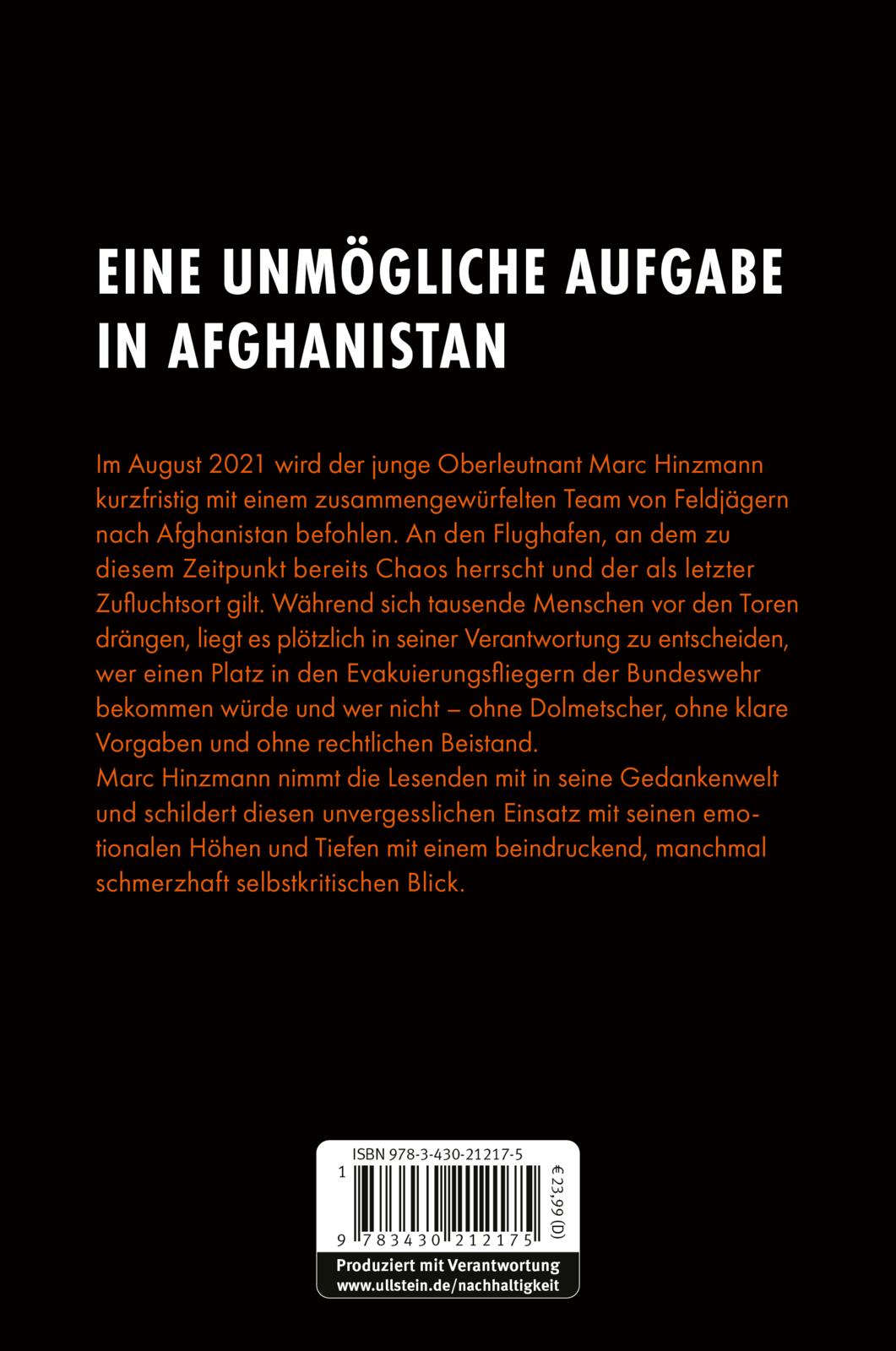 Im August 2021 wird der junge Oberleutnant Marc Hinzmann kurzfristig mit einem zusammengewürfelten Team von Feldjägern nach Afghanistan befohlen. An den Flughafen, an dem zu diesem Zeitpunkt bereits Chaos herrscht und der als letzter Zufluchtsort gilt. Während sich tausende Menschen vor den Toren drängen, liegt es plötzlich in seiner Verantwortung zu entscheiden, wer einen Platz im Evakuierungsflieger der Bundeswehr bekommen würde und wer nicht - ohne Dolmetscher, ohne klare Vorgaben und ohne rechtlichen Beistand.