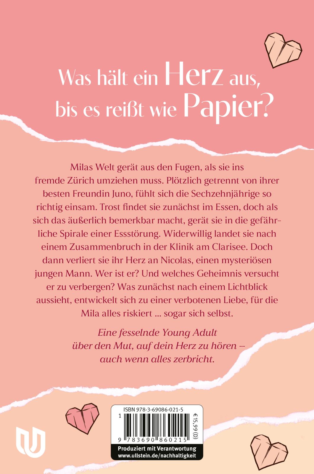 Milas Welt gerät aus den Fugen, als sie ins fremde Zürich umziehen muss. Plötzlich getrennt von ihrer besten Freundin Juno, fühlt sich die Sechzehnjährige so richtig einsam. Trost findet sie zunächst im Essen, doch als sich das äußerlich bemerkbar macht, gerät sie in die gefährliche Spirale einer Essstörung. Widerwillig landet sie nach einem Zusammenbruch in der Klinik am Clarisee. Doch dann verliert sie ihr Herz an Nicolas, einen mysteriösen jungen Mann. Wer ist er? Und welches Geheimnis versucht er zu verbergen? Was zunächst nach einem Lichtblick aussieht, entwickelt sich zu einer verbotenen Liebe, für die Mila alles riskiert ... sogar sich selbst.