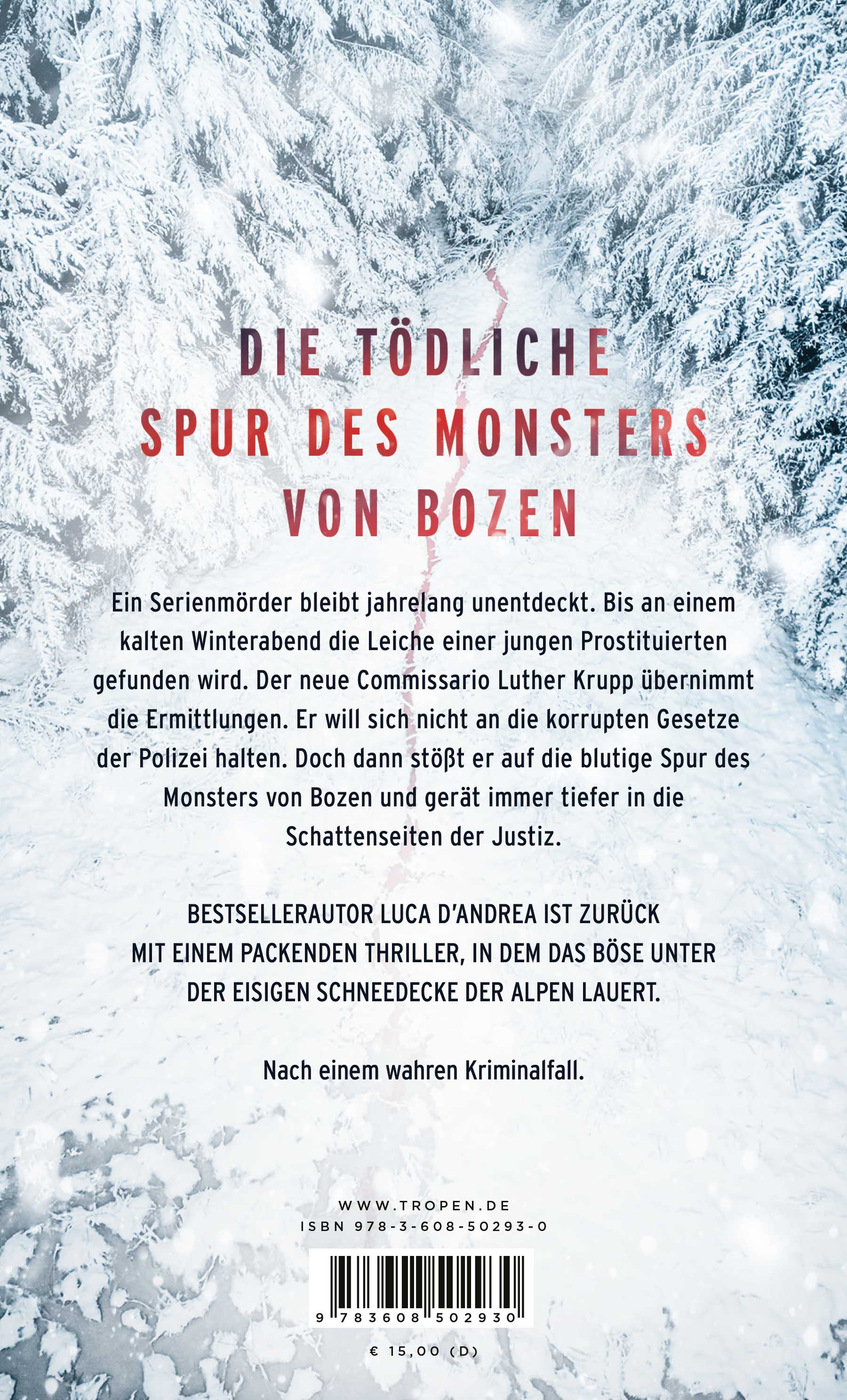 Ein Serienmörder bleibt jahrelang unentdeckt. Bis an einem kalten Winterabend die Leiche einer jungen Prostituierten gefunden wird. Der neue Commissario Luther Krupp übernimmt die Ermittlungen. Er will sich nicht an die korrupten Gesetze der Polizei halten. Doch dann stößt er auf die blutige Spur des Monsters von Bozen und gerät immer tiefer in die Schattenseiten der Justiz. Bestsellerautor Luca D'Andrea ist zurück mit einem packenden Thriller, in dem das Böse unter der eisigen Schneedecke der Alpen lauert.
