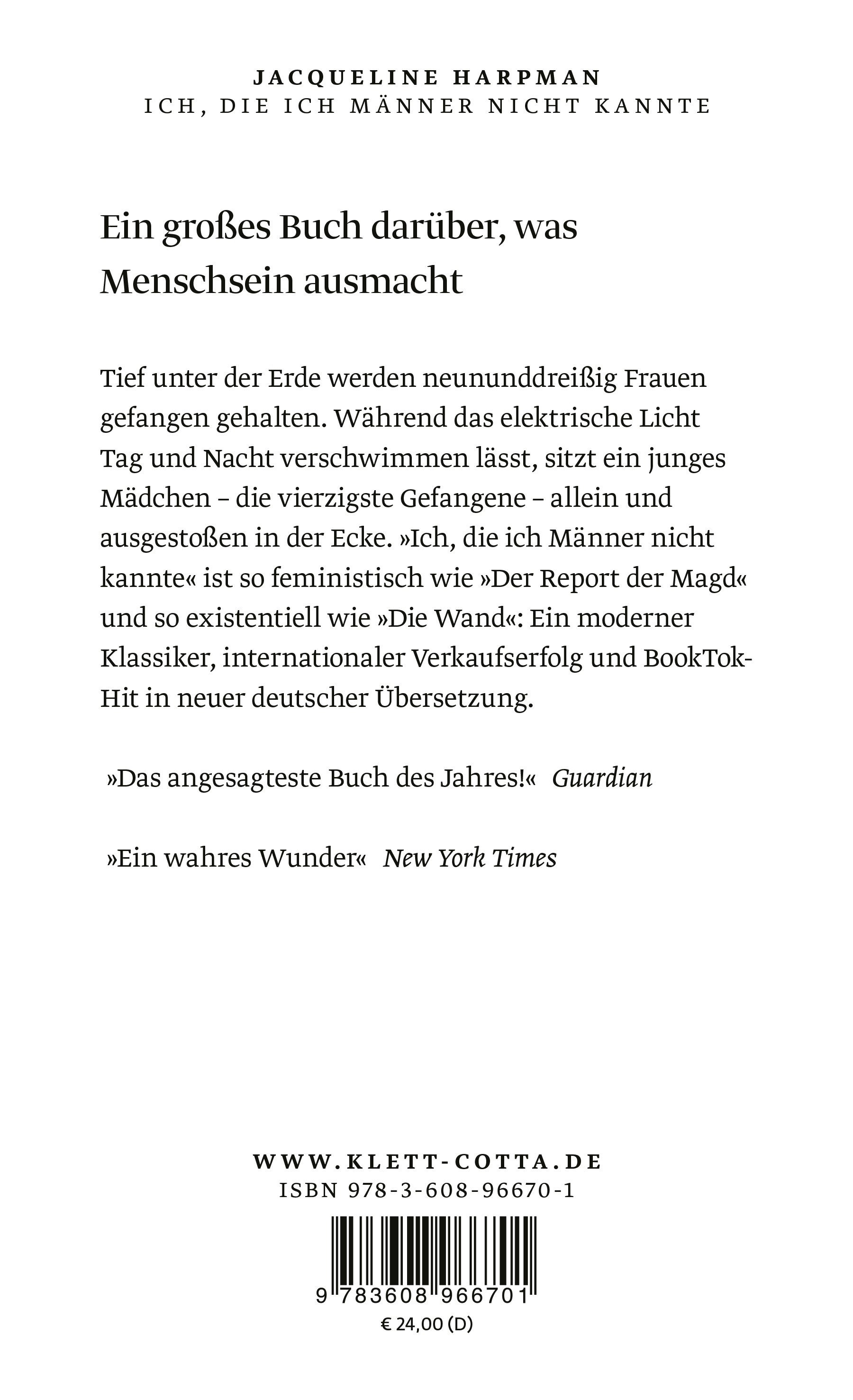 Tief unter der Erde werden neununddreißig Frauen gefangen gehalten. Während das elektrische Licht Tag und Nacht verschwimmen lässt, sitzt ein junges Mädchen - die vierzigste Gefangene - allein und ausgestoßen in der Ecke. »Ich, die ich Männer nicht kannte« ist so feministisch wie »Der Report der Magd« und so existentiell wie »Die Wand«: Ein moderner Klassiker, internationaler Verkaufserfolg und BookTok-Hit in neuer deutscher Übersetzung.
