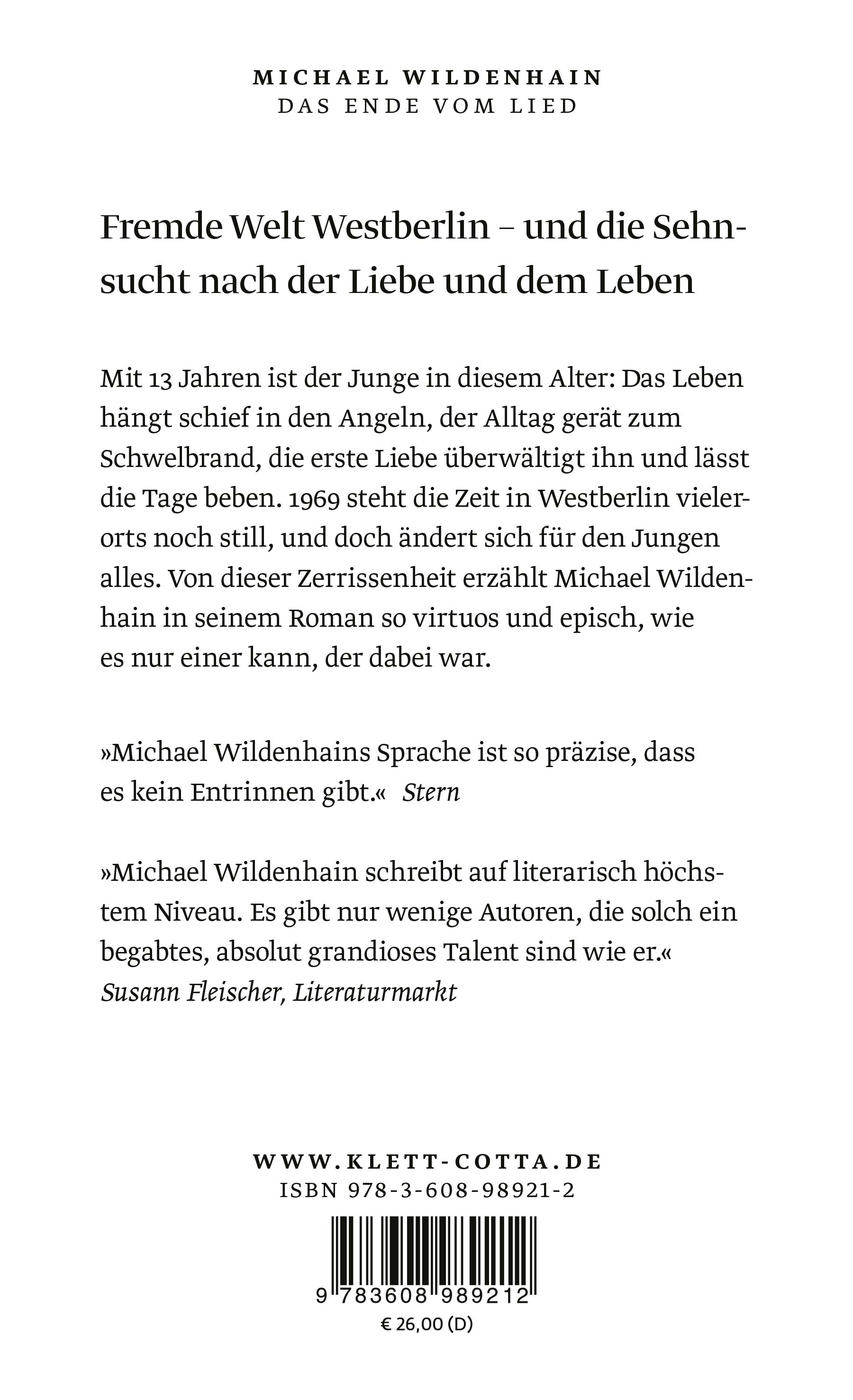 Mit 13 Jahren ist der Junge in diesem Alter: Das Leben hängt schief in den Angeln, der Alltag gerät zum Schwelbrand, die erste Liebe überwältigt ihn und lässt die Tage beben. 1969 steht die Zeit in Westberlin vielerorts noch still, und doch ändert sich für den Jungen alles. Von dieser Zerrissenheit erzählt Michael Wildenhain in seinem Roman so virtuos und episch, wie es nur einer kann, der dabei war.