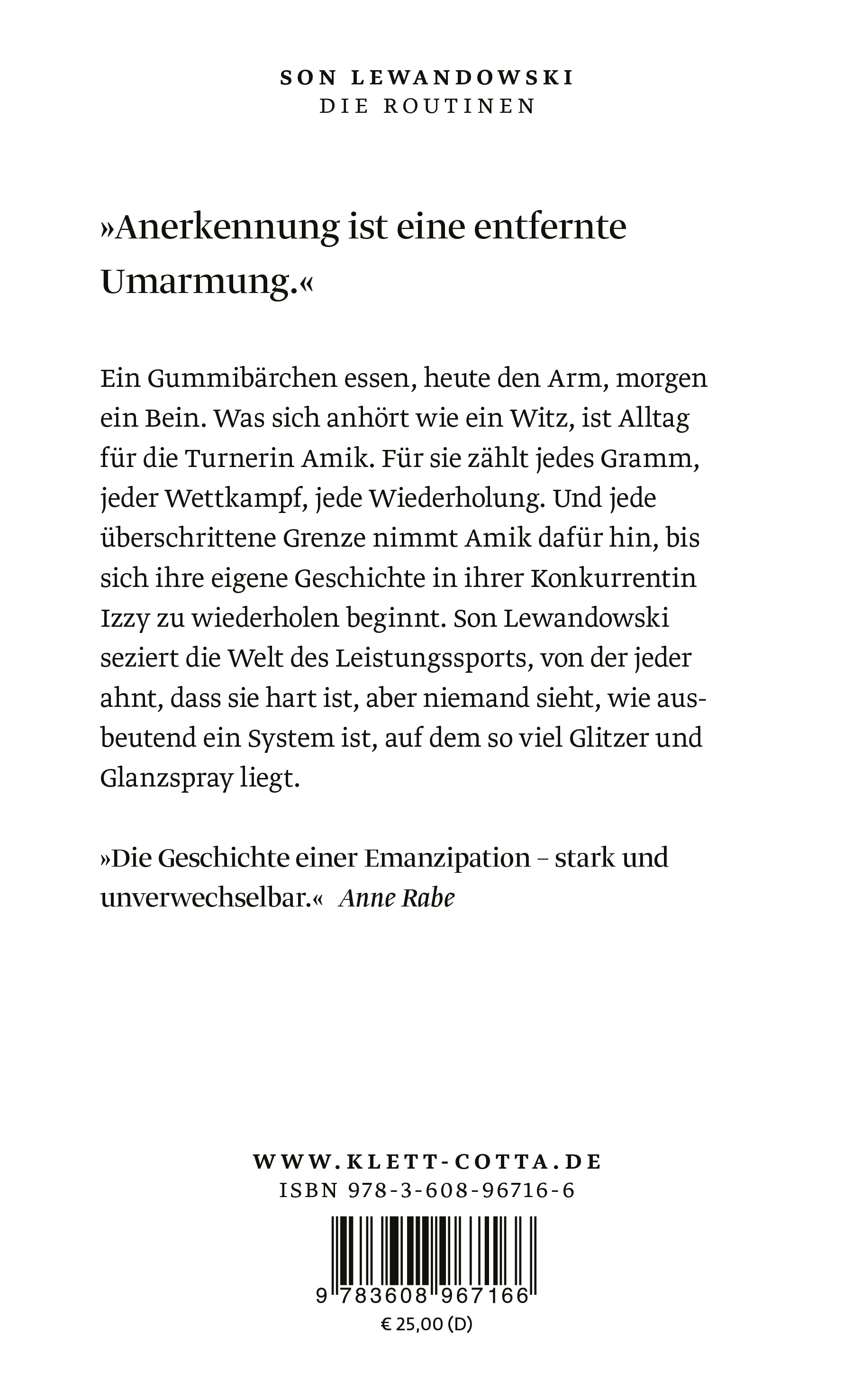 München. Montreal. Tokio. Wenn die olympischen Spiele anstehen, blickt die ganze Welt auf eine Stadt, auf eine Mannschaft, auf eine Leistungsturnerin. Die Mädchen und Frauen trainieren ihr gesamtes Leben auf diesen Moment hin. Aus diesem Wir der Turnerinnen, das in olympischen Jahren denkt, vom Training auf die Waage zu den Wettkämpfen gedrängt wird, entspringt ein Ich, die Turnerin Amik. Sie beugt sich den gnadenlosen Wettbewerbsprinzipien ihres Sports und mit jedem weiteren Schritt auf ein Siegerinnenpodest entfernt sie sich mehr von den Mädchen, die sie gestern noch getröstet haben. Auf kraftvolle Weise erzählt Son Lewandowski von Sport und Politik, von fragilen Beziehungen und den Grenzen des eigenen, alternden Körpers. Die Geschichten von berühmten Turnerinnen und der größte Missbrauchsskandal der Sportgeschichte werden in die Geschichte von Amik eingewebt und machen »Die Routinen« zu einer atemlosen Leseerfahrung.