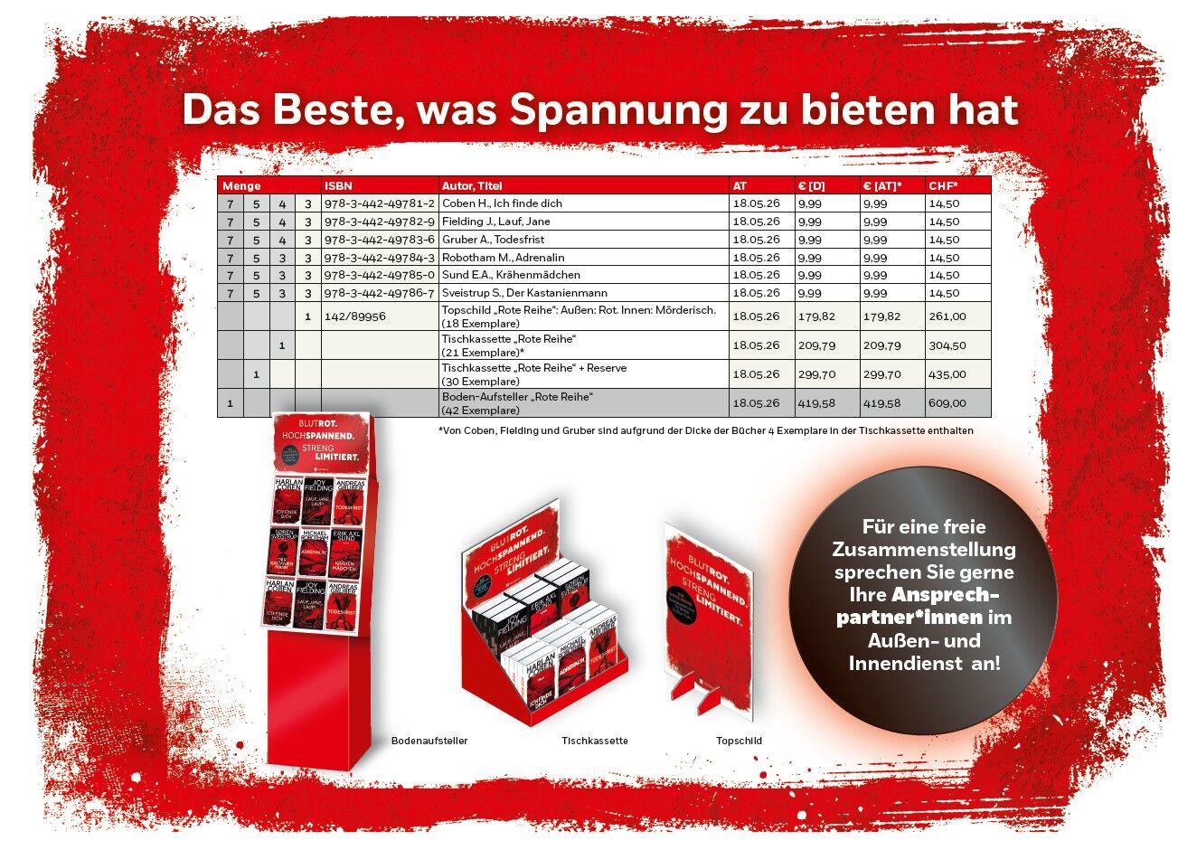 Die Bestseller-Vorlage zur erfolgreichen Netflix-Serie!Es ist ein stürmischer Tag in Kopenhagen, als die Polizei an einen grauenvollen Tatort gerufen wird. Auf einem Spielplatz liegt die entstellte Leiche einer jungen Frau. Und der Täter hat eine unheimliche Botschaft hinterlassen: Über dem leblosen Körper schwingt eine kleine Puppe aus Kastanien im Wind. Kommissarin Naia Thulin und ihr Partner Mark Hess stehen vor einem Rätsel. Denn die Figur trägt den Fingerabdruck eines Mädchens, das ein Jahr zuvor ermordet wurde - die Tochter der Politikerin Rosa Hartung. Und dann taucht ein zweites Kastanienmännchen auf ...Die Rote Reihe im Überblick:Harlan Coben: Ich finde dich