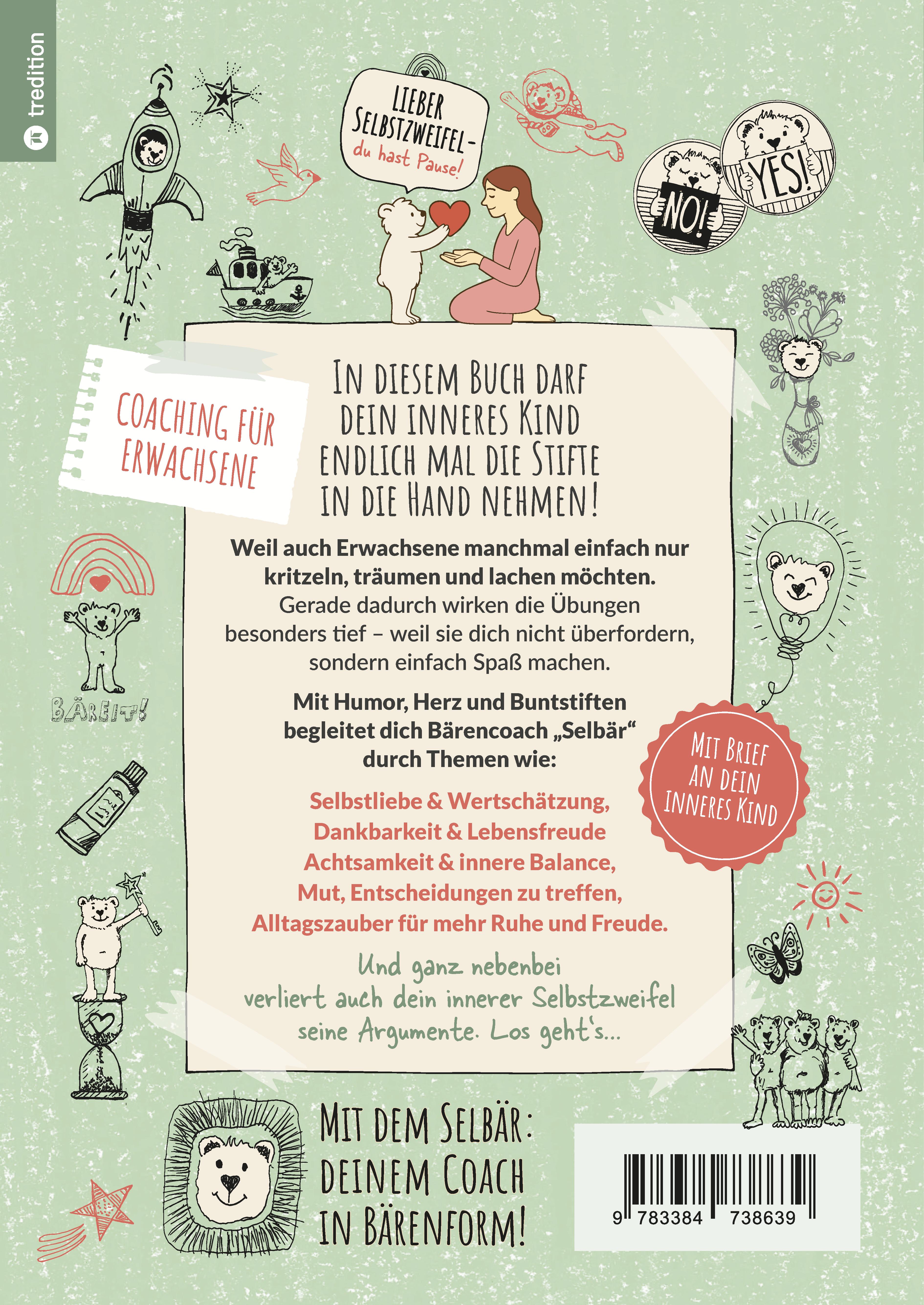 Dieses Buch überrascht - und das auf die liebevollste Weise.Obwohl es auf den ersten Blick verspielt und fast kindlich wirkt, verbirgt sich dahinter ein klug konzipiertes Coachingbuch für Erwachsene.Begleitet von Selbär, einem gezeichneten Coach in Bärenform, lädt es dazu ein, sich mit Stiften, Stickern und Gedanken dem eigenen Inneren zu nähern - leicht, aber nicht oberflächlich. Der Selbär führt (innerhab der Kapitel "Vergangenheit", "Gegenwart" und "Zukunft" durch zentrale Themen wie Selbstzweifel, Selbstwertgefühl, Achtsamkeit, Lebensfreude und Entscheidungsmut - immer mit Herz, Humor und klaren Impulsen.Viele Seiten lassen sich anmalen, bekleben und kreativ gestalten - so entsteht ein persönliches, fantasievolles Mitmachbuch für Erwachsene. Ein besonderes Highlight sind die drei persönlichen Briefe des Selbärs an den Leser/die Leserin, z.B. der Brief an das innere Kind.Dieser Zugang - durch Illustrationen, Emotion und spielerische Tiefe - macht das Buch so sympathisch, wirksam und ungewöhnlich zugleich. Es ist ein liebevoller Begleiter für alle Erwachsenen, die Selbstliebe, innere Stärke und Leichtigkeit auf ihre ganz eigene Art entdecken möchten.