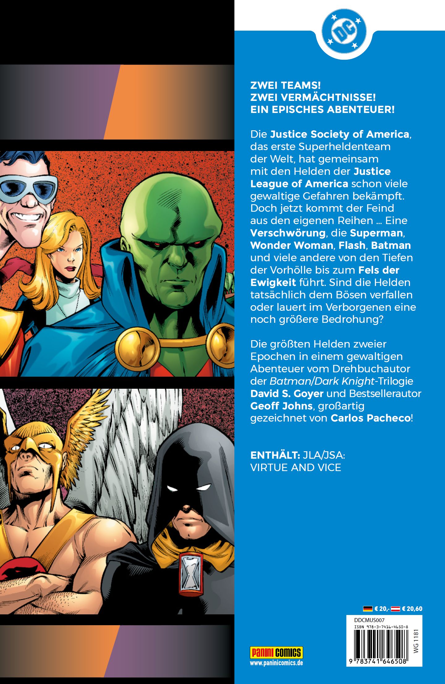 ZWEI TEAMS! ZWEI VERMÄCHTNISSE! EIN EPISCHES ABENTEUER! Die Justice Society of America, das erste Superheldenteam der Welt, hat gemeinsam mit den Helden der Justice League of America schon viele gewaltige Gefahren bekämpft. Doch jetzt kommt der Feind aus den eigenen Reihen ... Eine Verschwörung, die Superman, Wonder Woman, Flash, Batman und viele andere von den Tiefen der Vorhölle bis zum Fels der Ewigkeit führt. Sind die Helden tatsächlich dem Bösen verfallen oder lauert im Verborgenen eine noch größere Bedrohung? Die größten Helden zweier Epochen in einem gewaltigen Abenteuer vom Drehbuchautor der Batman/Dark Knight-Trilogie David S. Goyer und Bestsellerautor Geoff Johns, großartig gezeichnet von Carlos Pacheco! ENTHÄLT: JLA/JSA: VIRTUE AND VICE