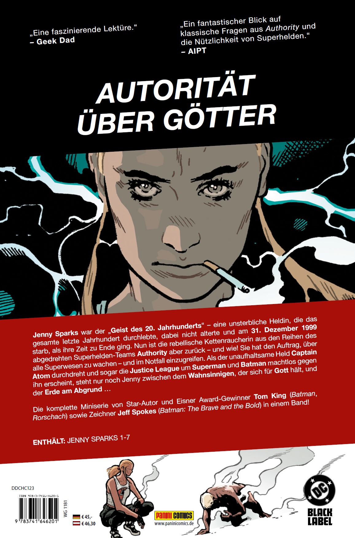 AUTORITÄT ÜBER GÖTTERJenny Sparks war der "Geist des 20. Jahrhunderts" - eine unsterbliche Heldin, die das gesamte letzte Jahrhundert durchlebte, dabei nicht alterte und am 31. Dezember 1999 starb, als ihre Zeit zu Ende ging. Nun ist die rebellische Kettenraucherin aus den Reihen des abgedrehten Superhelden-Teams Authority aber zurück - und wie! Sie hat den Auftrag, über alle Superwesen zu wachen - und im Notfall einzugreifen. Als der unaufhaltsame Held Captain Atom durchdreht und sogar die Justice League um Superman und Batman machtlos gegen ihn erscheint, steht nur noch Jenny zwischen dem Wahnsinnigen, der sich für Gott hält, und der Erde am Abgrund ...Die komplette Miniserie von Star-Autor und Eisner Award-Gewinner Tom King (Batman, Rorschach) sowie Zeichner Jeff Spokes (Batman: The Brave and the Bold) in einem Band! ENTHÄLT: JENNY SPARKS 1-7