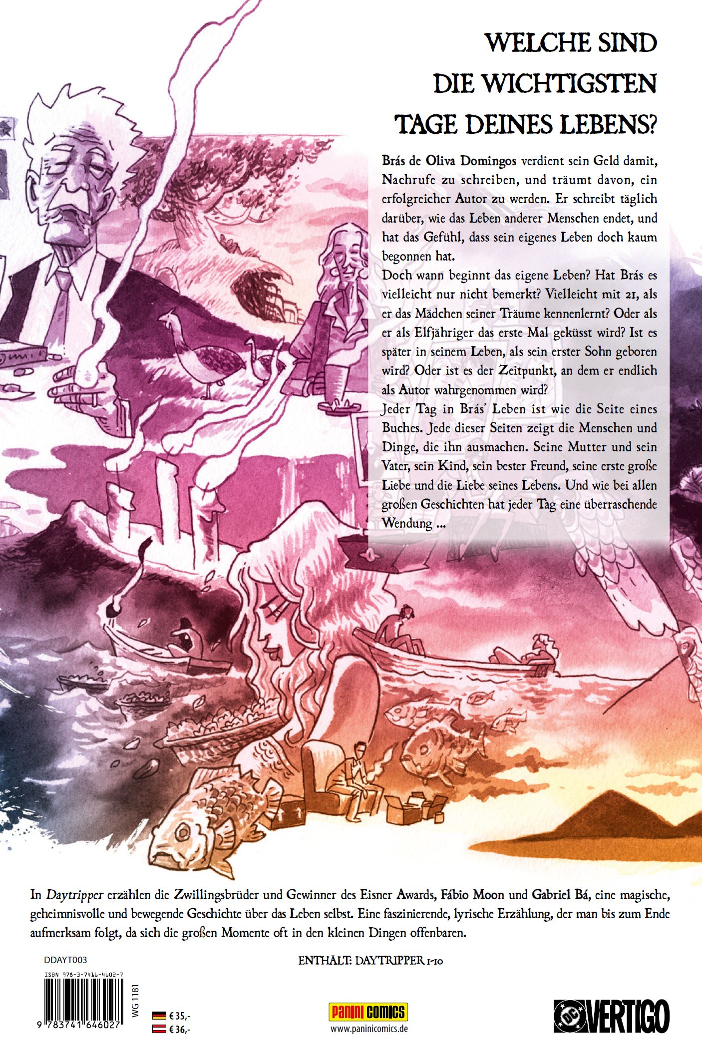 WELCHE SIND DIE WICHTIGSTEN TAGE DEINES LEBENS?Brás de Oliva Domingos verdient sein Geld damit, Nachrufe zu schreiben, und träumt davon, ein erfolgreicher Autor zu werden. Er schreibt täglich darüber, wie das Leben anderer Menschen endet, und hat das Gefühl, dass sein eigenes Leben doch kaum begonnen hat.Doch wann beginnt das eigene Leben? Hat Brás es vielleicht nur nicht bemerkt? Vielleicht mit 21, als er das Mädchen seiner Träume kennenlernt? Oder als er als Elfjähriger das erste Mal geküsst wird? Ist es später in seinem Leben, als sein erster Sohn geboren wird? Oder ist es der Zeitpunkt, an dem er endlich als Autor wahrgenommen wird? Jeder Tag in Brás' Leben ist wie die Seite eines Buches. Jede dieser Seiten zeigt die Menschen und Dinge, die ihn ausmachen. Seine Mutter und sein Vater, sein Kind, sein bester Freund, seine erste große Liebe und die Liebe seines Lebens. Und wie bei allen großen Geschichten hat jeder Tag eine überraschende Wendung ...In Daytripper erzählen die Zwillingsbrüder und Gewinner des Eisner Awards, Fábio Moon und Gabriel Bá, eine magische, geheimnisvolle und bewegende Geschichte über das Leben selbst. Eine faszinierende, lyrische Erzählung, der man bis zum Ende aufmerksam folgt, da sich die großen Momente oft in den kleinen Dingen offenbaren. ENTHÄLT: DAYTRIPPER 1-10