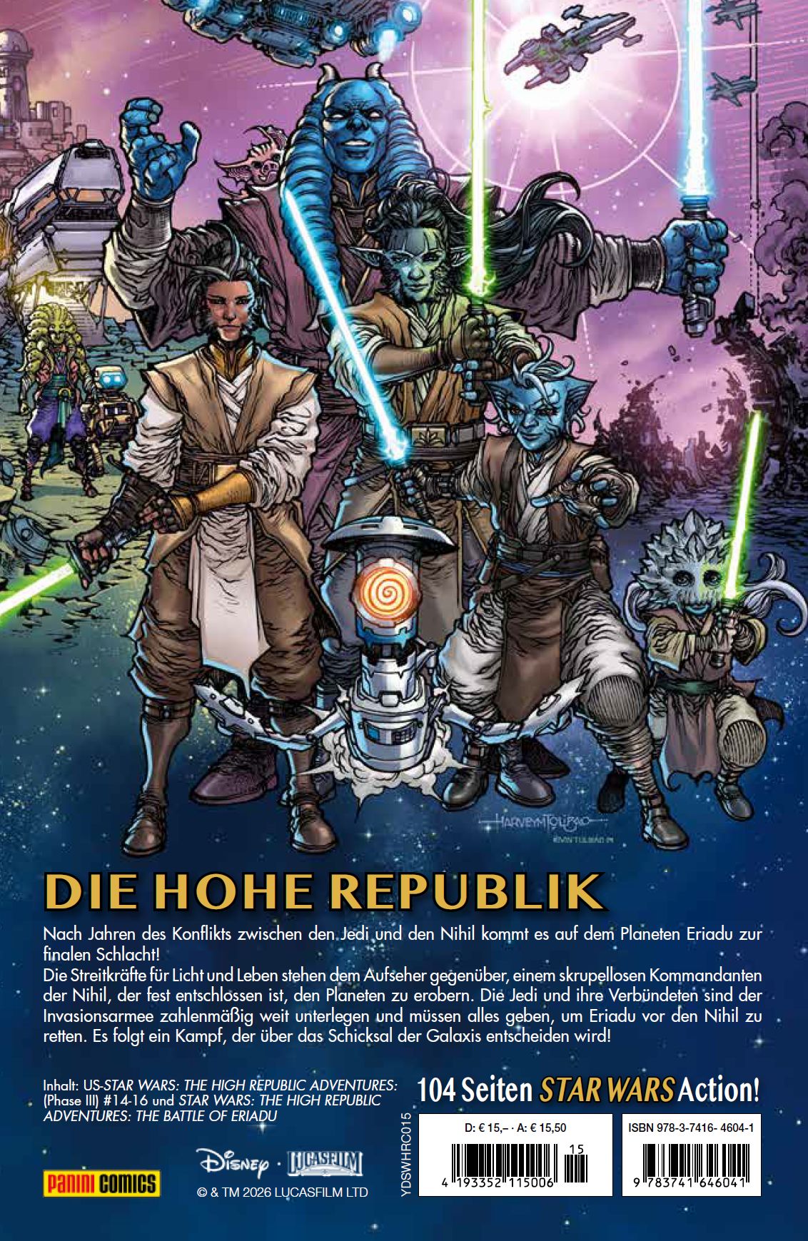 DIE HOHE REPUBLIK Nach Jahren des Konflikts zwischen den Jedi und den Nihil kommt es auf dem Planeten Eriadu zur finalen Schlacht! Die Streitkräfte für Licht und Leben stehen dem Aufseher gegenüber, einem skrupellosen Kommandanten der Nihil, der fest entschlossen ist, den Planeten zu erobern. Die Jedi und ihre Verbündeten sind der Invasionsarmee zahlenmäßig weit unterlegen und müssen alles geben, um Eriadu vor den Nihil zu retten. Es folgt ein Kampf, der über das Schicksal der Galaxis entscheiden wird! Inhalt: US-STAR WARS: THE HIGH REPUBLIC ADVENTURES: (Phase III) #14-16 und STAR WARS: THE HIGH REPUBLIC ADVENTURES: THE BATTLE OF ERIADU