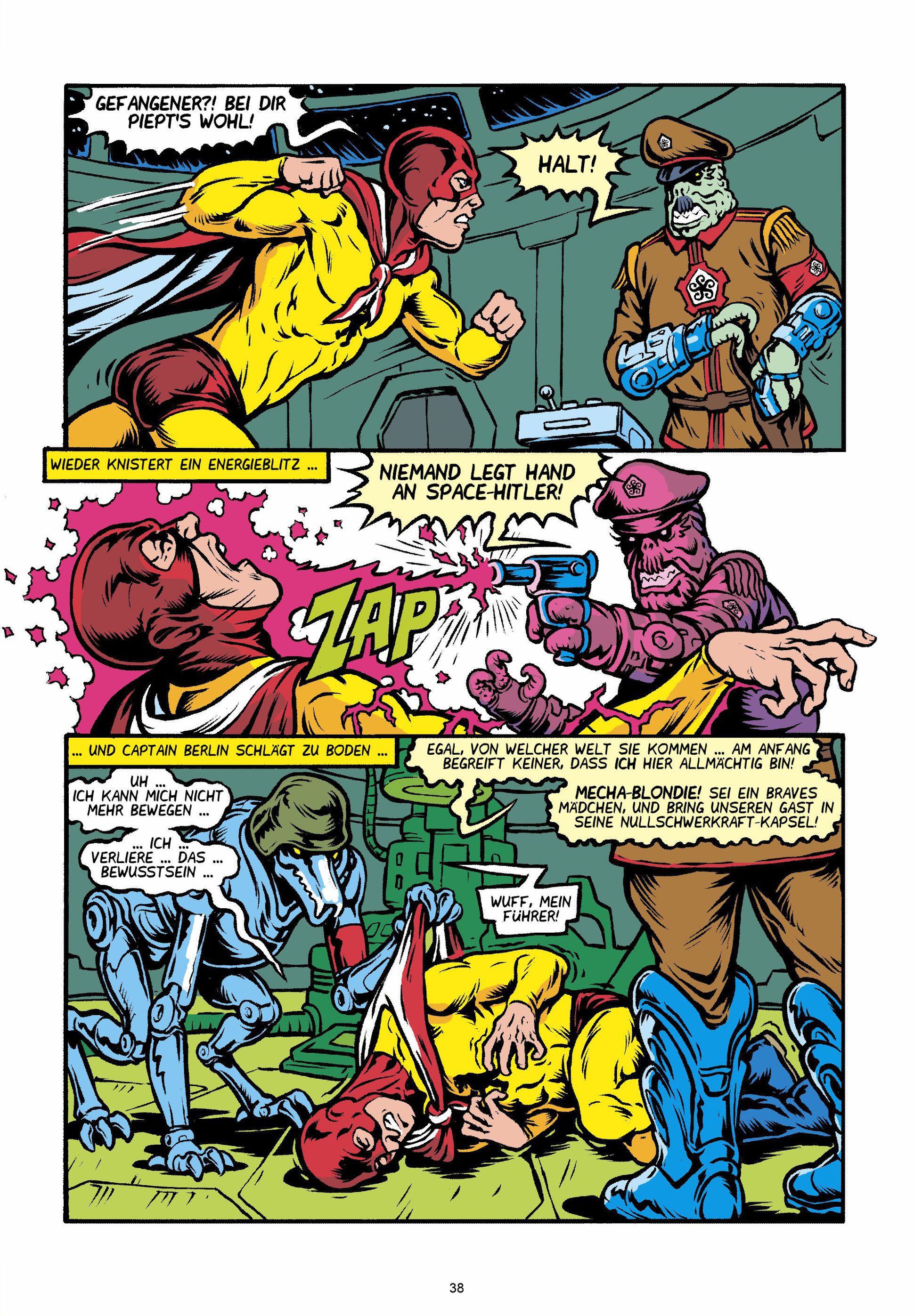 Captain Berlin, der einzig wahre deutsche Superheld, wurde 1944 vom antifaschistischen Widerstand geschaffen, um Adolf Hitler zu besiegen. Er ist ein biologisch manipulierter Supermensch, der bis zum heutigen Tag das Gute verteidigt und weltweit einen unerschrockenen Kampf gegen mächtige Schurken aufnimmt.Endlich werden in diesem Band sämtliche Geschichten aus den teilweise schon lange vergriffenen Heften CAPTAIN BERLIN # 9 bis #12 in der Reihenfolge der Erscheinens vereint.Bizarre Bösewichter wollen Captain Berlin den Garaus machen! Seine alte Erzfeindin Ilse von Blitzen kehrt zurück - angeschwollen auf Riesengröße. Space-Hitler beamt ihn ins All und lässt seine Robo-Blondie auf ihn los ...und auch sonst hat der Held der Hauptstadt es nicht leicht: Ein unechter Captain Berlin will ihm seine Identität stehlen, man geht gerichtlich gegen ihn vor - und dann soll er auch noch für den ganzen Schaden bezahlen, der bei den Riesenschlägereien verursacht wurde ... Ein superstarkes Lesevergnügen aus der WEISSBLECH Comics-Werkstatt, ideal für Neueinsteiger, Sammler und Originalheftschoner!
