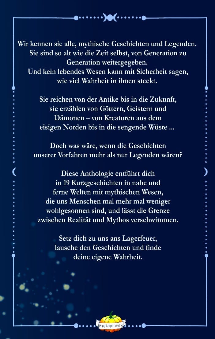 Diese Anthologie entführt dich in 19 Kurzgeschichten in nahe und ferne Welten mit mythischen Wesen, die uns Menschen mal mehr mal weniger wohlgesonnen sind, und lässt die Grenze zwischen Realität und Mythos verschwimmen.