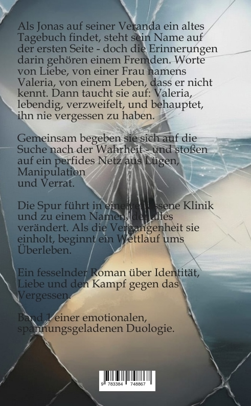 Als Jonas auf seiner Veranda ein altes Tagebuch mit seinem Namen findet, beginnt für ihn eine Reise in eine unbekannte Vergangenheit. Erinnerungen an eine Frau namens Valeria, an ein gemeinsames Leben, tauchen auf - doch Jonas erkennt nichts wieder.Dann steht Valeria plötzlich vor ihm. Sie behauptet, ihn zu kennen, ihn geliebt zu haben. Gemeinsam begeben sie sich auf die Suche nach der Wahrheit - und stoßen auf ein perfides Netz aus Lügen, Manipulation und Verrat.Wer hat Jonas' Erinnerungen gelöscht?Und warum?Die Spur führt in eine verlassene Klinik - und zu einem Namen, der alles verändert. Als die Vergangenheit sie einholt, beginnt ein Wettlauf ums Überleben. Denn nicht jeder, der ihnen nahesteht, spielt mit offenen Karten.