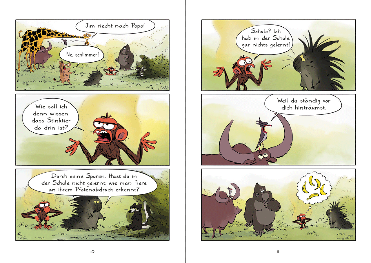 Puh, das stinkt vielleicht! Jim hat sich beim Verstecken ausgerechnet die Wurzelhöhle ausgesucht, die schon von Stinktier besetzt war. Und das nur, weil er in der Schule nicht aufgepasst hat, als es ums Spurenlesen ging. Also melden ihn Nick und die anderen kurzerhand bei Lehrer Bär an, wo er mit Madenhackers Küken und anderen vorlauten Tierkindern erneut die Schulbank drücken muss. Ob das gut geht? Jim hat sich fest vorgenommen, sich diesmal zu konzentr… oh, Bananen! Umgeben von frechen Krokodilbabys und niedlichem Nilpferd-Nachwuchs erkennt der miesgelaunte KultCharakter schließlich, dass man aus Fehlern am besten lernt – von Suzanne und Max Lang wie immer herzerwärmend erzählt und zum Kringeln komisch.
