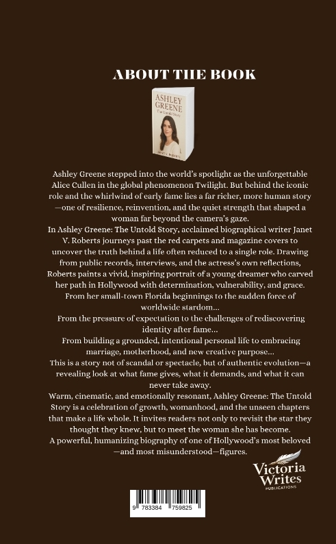She became a global sensation overnight-yet the world never truly knew her.From her breakout role as Alice Cullen in the worldwide phenomenon Twilight to her evolution into a thoughtful, grounded, and quietly resilient woman, Ashley Greene's journey has long been viewed through the lens of fame. But behind the red carpets, flashing cameras, and cultural impact lies a deeper story-one shaped not by Hollywood mythology, but by humanity, intention, and strength.Ashley Greene: The Untold Story is a powerful, intimate, and fully factual biography that reveals the woman behind the phenomenon. Moving beyond headlines and fan theories, bestselling biographical author Janet V. Roberts paints a cinematic and emotionally compelling portrait of an actress who navigated extraordinary fame while holding tightly to the values that shaped her long before millions knew her name.Through meticulous research and a warm, narrative-driven approach, this biography explores:- Her early years in Florida-where ambition, discipline, and resilience were forged.- Her bold leap to Los Angeles, chasing a dream few believed possible.- The making of a global franchise, and how sudden fame transforms a life overnight.- The pressures and expectations of Hollywood, and the quiet challenges viewers never see.- Her steady evolution beyond the role that defined her for millions.- Her personal life in adulthood-marriage, motherhood, and meaning-based only on publicly shared facts.- Her emerging voice as a thoughtful commentator, creator, and advocate for mindful living.This is not a story of scandal.This is a story of becomingTold with elegance, depth, and emotional clarity, Ashley Greene: The Untold Story reveals what fame illuminates-and what it can never take away: identity, purpose, and the inner strength of a woman determined to grow on her own terms