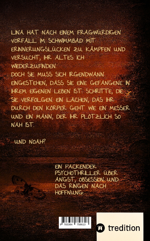 Ich bin 33 Jahre alt, Zweifach-Mama und bin in einer kleinen Altstadt aufgewachsen, wo ich immer noch lebe. Ich liebe meine Heimat. Hier fühle ich mich am wohlsten. Seitdem ich 17 Jahre alt bin, schreibe ich Geschichten. Mein großes Ziel war es immer, das erste Buch bis zu meinem 30. Lebensjahr zu veröffentlichen. Leider habe ich das durch den Alltagsstress nicht geschafft. Dann kam mir 2025 schlagartig die Idee für einen Thriller und ich konnte gar nicht mehr aufhören zu schreiben. Der Weg über einen Verlag war mir zu lang, denn ich wollte dieses Buch mit den Menschen teilen und zwar am liebsten sofort ! Also habe ich mich erkundigt und alles über das Thema Selfpublishing studiert. Dann bin ich bei tredition gelandet und tadaaa: da ist er, mein Psychothriller. Wenn ich nicht gerade an einer Geschichte schreibe oder mich mit meinen zwei Kindern beschäftige, arbeite ich auf Teilzeitbasis als Kauffrau im Gesundheitswesen, treffe mich mit meinen Freunden oder verbringe sehr gerne sehr viel Zeit mit meiner Familie.