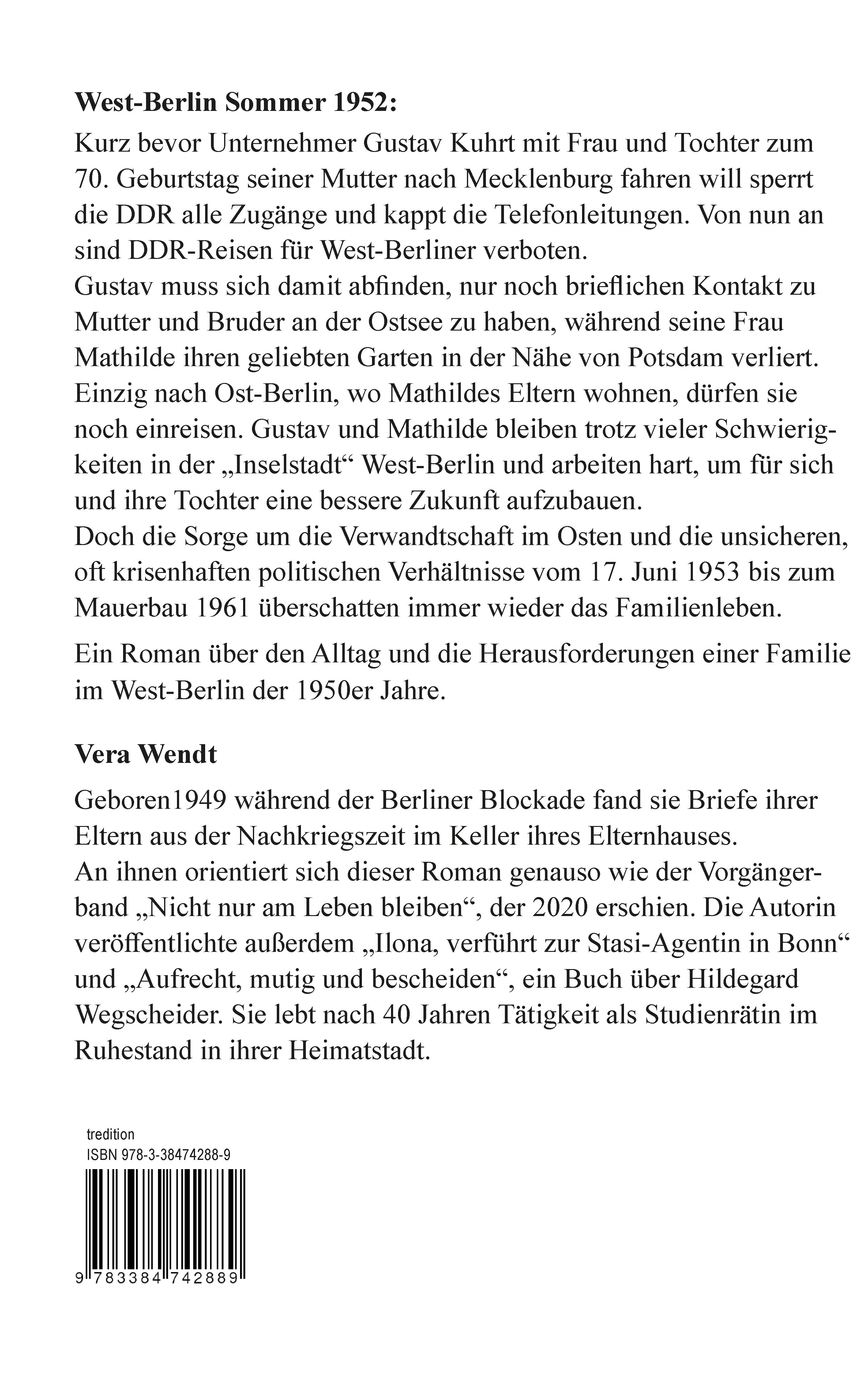 West-Berlin, Sommer 1952: Kurz bevor der Unternehmer Gustav Kuhrt mit Frau und dreijähriger Tochter zum 70. Geburtstag seiner Mutter nach Mecklenburg fahren will sperrt die DDR alle Zugänge und kappt die Telefonleitungen. Von nun an sind DDR-Reisen für West-Berliner verboten. Gustav muss sich damit abfinden, nur noch brieflichen Kontakt zu Mutter und Bruder an der Ostsee zu haben, während seine Frau Mathilde ihren geliebten Garten in der Nähe von Potsdam verliert. Einzig nach Ost-Berlin, wo Mathildes Eltern wohnen, dürfen sie noch einreisen. Gustav und Mathilde bleiben trotz vieler Schwierigkeiten in der "Inselstadt" West-Berliln und arbeiten hart, um für sich und ihre Tochter eine bessere Zukunft aufzubauen. Doch die Sorge um die Verwandten im Osten und die unsicheren, oft krisenhaften politischen Verhältnisse vom 17. Juni 1953 bis zum Mauerbau 1961 überschatten immer wieder das Familienleben. Ein Roman über den Alltag und die Herausforderungen einer FAmilie im West-Berlin der 1950er Jahre.