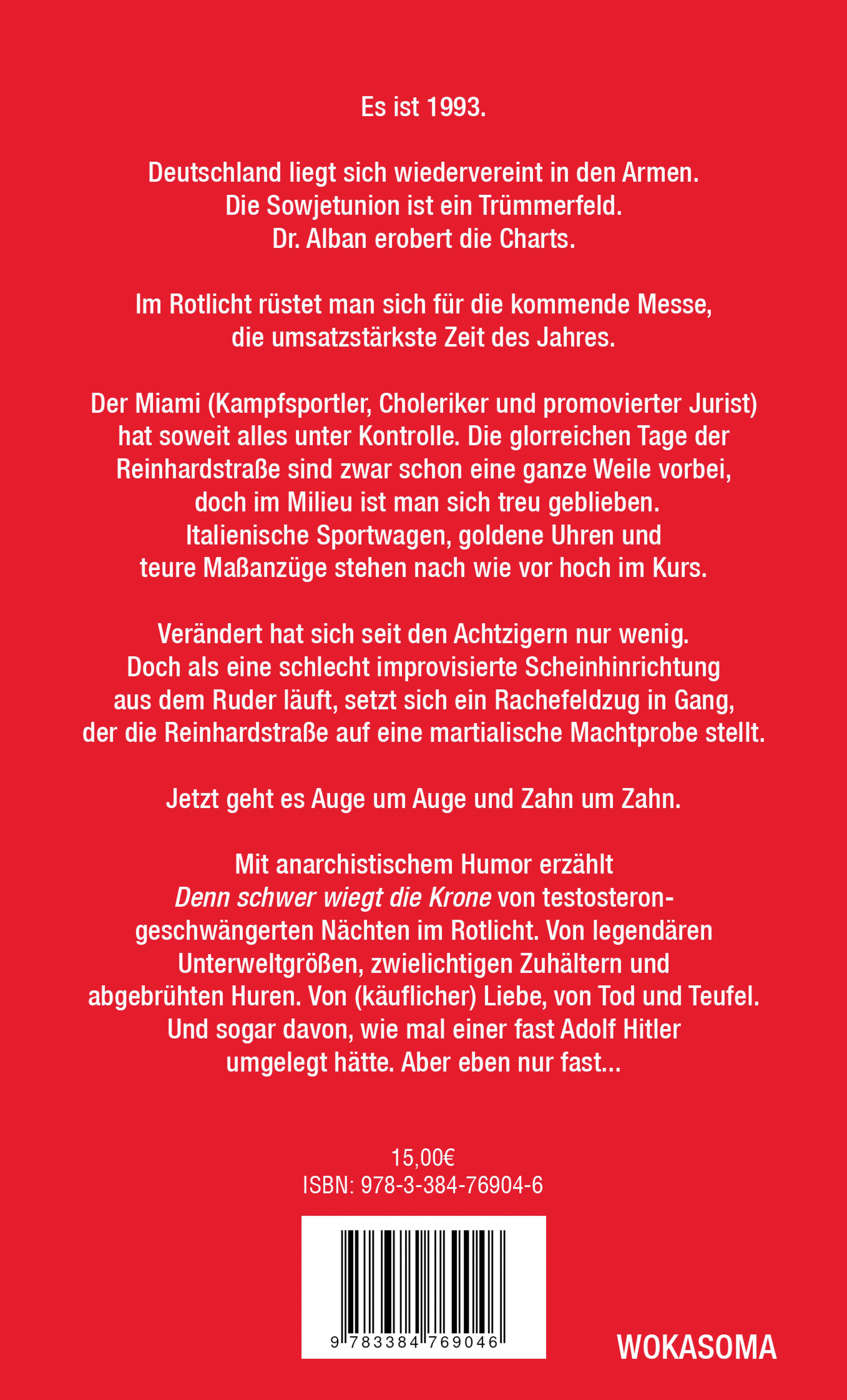 "Ein deutscher Tarantino als Buch."Es ist 1993. Deutschland liegt sich wiedervereint in den Armen. Die Sowjetunion ist ein Trümmerfeld. Dr. Alban erobert die Charts. Im Rotlicht rüstet man sich für die kommende Messe, die umsatzstärkste Zeit des Jahres. Der Miami (Kampfsportler, Choleriker und promovierter Jurist) hat so weit alles unter Kontrolle. Italienische Sportwagen, goldene Uhren und teure Maßanzüge stehen nach wie vor hoch im Kurs. Verändert hat sich seit den Achtzigern nur wenig. Doch als eine schlecht improvisierte Scheinhinrichtung aus dem Ruder läuft, setzt sich ein Rachefeldzug in Gang, der die Reinhardstraße auf eine martialische Machtprobe stellt. Jetzt geht es Auge um Auge und Zahn um Zahn.Dieser Autor hat mit der aktuellen Gegenwartsliteratur nicht das Geringste zu tun. Und das ist gut so!
