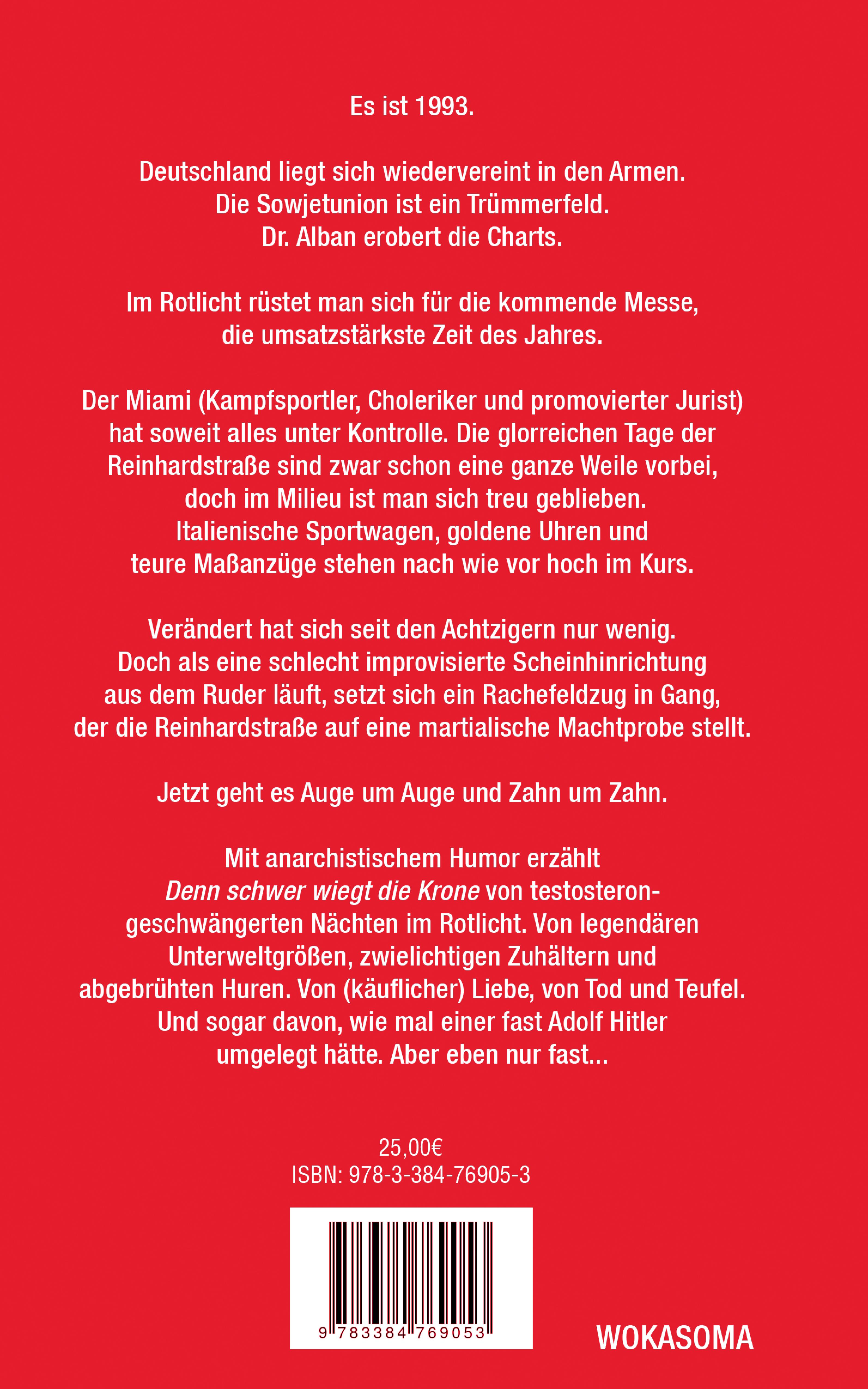 "Ein deutscher Tarantino als Buch."Es ist 1993. Deutschland liegt sich wiedervereint in den Armen. Die Sowjetunion ist ein Trümmerfeld. Dr. Alban erobert die Charts. Im Rotlicht rüstet man sich für die kommende Messe, die umsatzstärkste Zeit des Jahres. Der Miami (Kampfsportler, Choleriker und promovierter Jurist) hat so weit alles unter Kontrolle. Italienische Sportwagen, goldene Uhren und teure Maßanzüge stehen nach wie vor hoch im Kurs. Verändert hat sich seit den Achtzigern nur wenig. Doch als eine schlecht improvisierte Scheinhinrichtung aus dem Ruder läuft, setzt sich ein Rachefeldzug in Gang, der die Reinhardstraße auf eine martialische Machtprobe stellt. Jetzt geht es Auge um Auge und Zahn um Zahn.Dieser Autor hat mit der aktuellen Gegenwartsliteratur nicht das Geringste zu tun. Und das ist gut so!