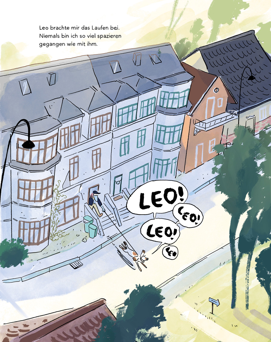 einfach“, befindet er, „der Trick sind die Buchstaben“. Den lesehungrigen Hund zieht es bald nur noch in die Stadt, wo sein Mensch sich vor all den Schildern und Schaufenstern, die Leo entziffert, die Beine in den Bauch steht, statt sie sich in der Natur zu vertreten – wozu hat Mensch denn einen Hund?! „Leo, lass das Lesen!“ Zum Glück lässt er es nicht, denn schon beim nächsten Ausflug wird Leo zum lesenden Lebensretterhund!
