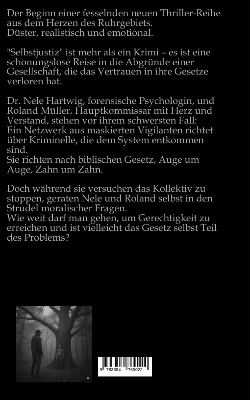 Der Beginn einer fesselnden neuen Thrillerreihe aus dem Herzen des Ruhrgebiets.Düster, realistisch und emotional."Selbstjustiz" ist mehr als ein Krimi - es ist eine schonungslose Reise in die Abgründe einer Gesellschaft, die das Vertrauen in ihre Gesetze verloren hat.Dr. Nele Hartwig, forensische Psychologin, und Roland Müller, Hauptkommissar mit Herz und Verstand, stehen vor ihrem schwersten Fall:Ein Netzwerk aus maskierten Vigilanten richtet über Kriminelle, die dem System entkommen sind.Doch während sie versuchen das Kollektiv zu stoppen, geraten Nele und Roland selbst in den Strudel moralischer Fragen.Wie weit darf man gehen, um Gerechtigkeit zu erreichen und ist vielleicht das Gesetz selbst Teil des Problems?