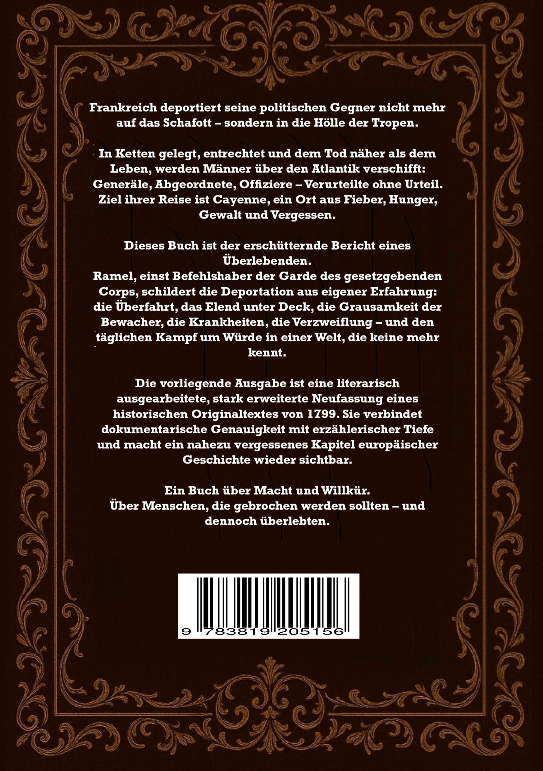 Der Bericht folgt der Stimme Ramels eines der wenigen Überlebenden und ehemaligen Befehlshabers der Garde des gesetzgebenden Corps Frankreichs. Mit eindringlicher Klarheit schildert er die Überfahrt unter Deck die Grausamkeit der Bewacher das Sterben an Bord und den täglichen Kampf um Würde in einer Welt die keine mehr kennt.