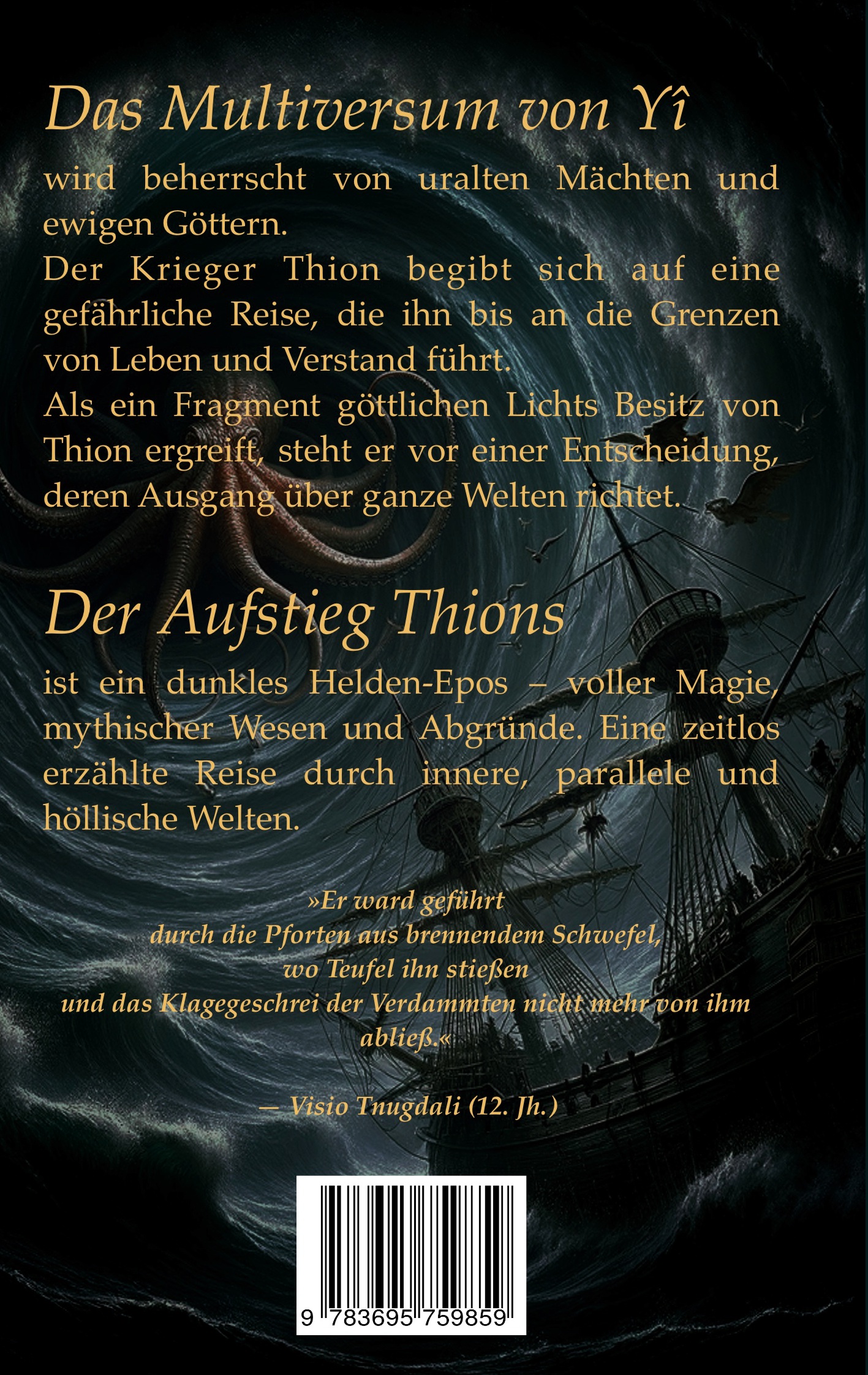 Die bewusst mittelalterlich anmutende Erzählung spannt ihren Bogen vom mythischen Ursprung über die göttliche Auserwählung und Prüfung Thions bis hin zur gewaltigen Schlacht und Thronerhebung der anderen Art - eine Reise durch innere, parallele und höllische Welten.