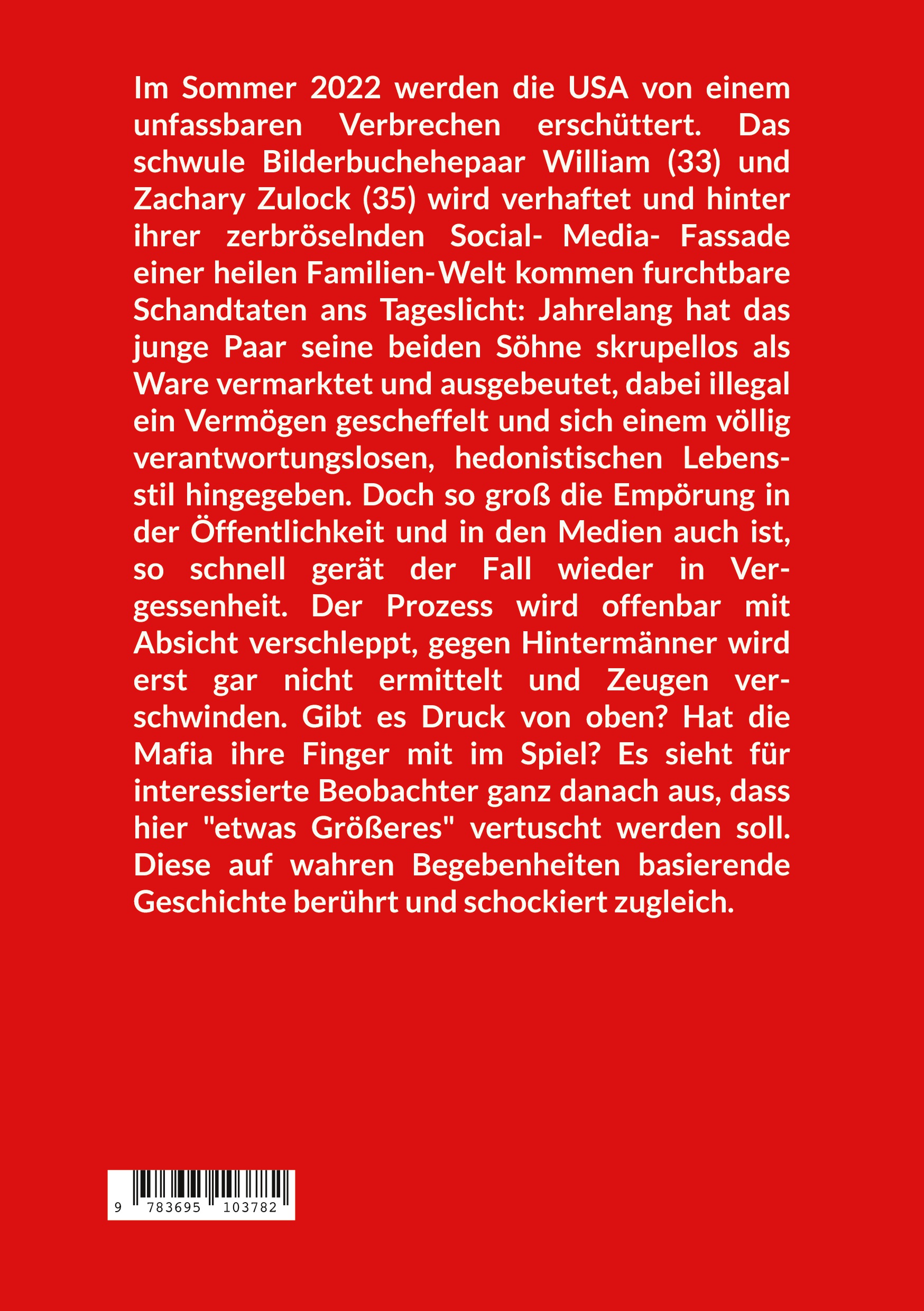 Im Sommer 2022 werden die USA von einem unfassbaren Verbrechen erschüttert. Das schwule Bilderbuchehepaar William (33) und Zachary Zulock (35) wird verhaftet und hinter ihrer zerbröselnden Social-Media-Fassade einer heilen Familien-Welt kommen furchtbare Schandtaten ans Tageslicht: Jahrelang hat das junge Paar seine beiden Söhne skrupellos als Ware vermarktet und ausgebeutet, dabei illegal ein Vermögen gescheffelt und sich einem völlig verantwortungslosen, hedonistischen Lebensstil hingegeben. Doch so groß die Empörung in der Öffentlichkeit und in den Medien auch ist, so schnell gerät der Fall wieder in Vergessenheit. Der Prozess wird offenbar mit Absicht verschleppt, gegen Hintermänner wird erst gar nicht ermittelt und Zeugen verschwinden. Gibt es Druck von oben? Hat die Mafia ihre Finger mit im Spiel? Es sieht für interessierte Beobachter ganz danach aus, dass hier "etwas Größeres" vertuscht werden soll. Diese auf wahren Begebenheiten basierende Geschichte berührt und schockiert zugleich.