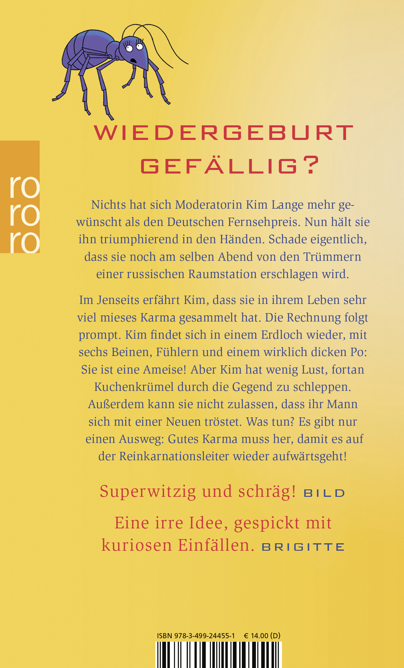 Im Jenseits erfährt Kim, dass sie in ihrem Leben sehr viel mieses Karma gesammelt hat. Die Rechnung folgt prompt. Kim findet sich in einem Erdloch wieder, mit sechs Beinen, Fühlern und einem wirklich dicken Po: Sie ist eine Ameise! Aber Kim hat wenig Lust, fortan Kuchenkrümel durch die Gegend zu schleppen. Außerdem kann sie nicht zulassen, dass ihr Mann sich mit einer Neuen tröstet. Was tun? Es gibt nur einen Ausweg: Gutes Karma muss her, damit es auf der Reinkarnationsleiter wieder aufwärts geht!