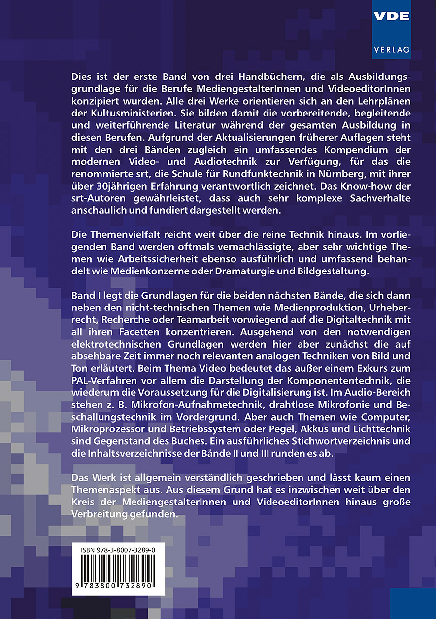 Dies ist der erste Band von drei Handbüchern, die als Ausbildungsgrundlage für die Berufe MediengestalterInnen und VideoeditorInnen konzipiert wurden. Alle drei Werke orientieren sich an den Lehrplänen der Kultusministerien. Sie bilden damit die vorbereitende, begleitende und weiterführende Literatur während der gesamten Ausbildung in diesen Berufen. Aufgrund der Aktualisierungen früherer Auflagen steht mit den drei Bänden zugleich ein umfassendes Kompendium der modernen Video- und Audiotechnik zur Verfügung, für das die renommierte srt, die Schule für Rundfunktechnik in Nürnberg, mit ihrer über 30jährigen Erfahrung verantwortlich zeichnet. Das Know-how der srt-Autoren gewährleistet, dass auch sehr komplexe Sachverhalte anschaulich und fundiert dargestellt werden.