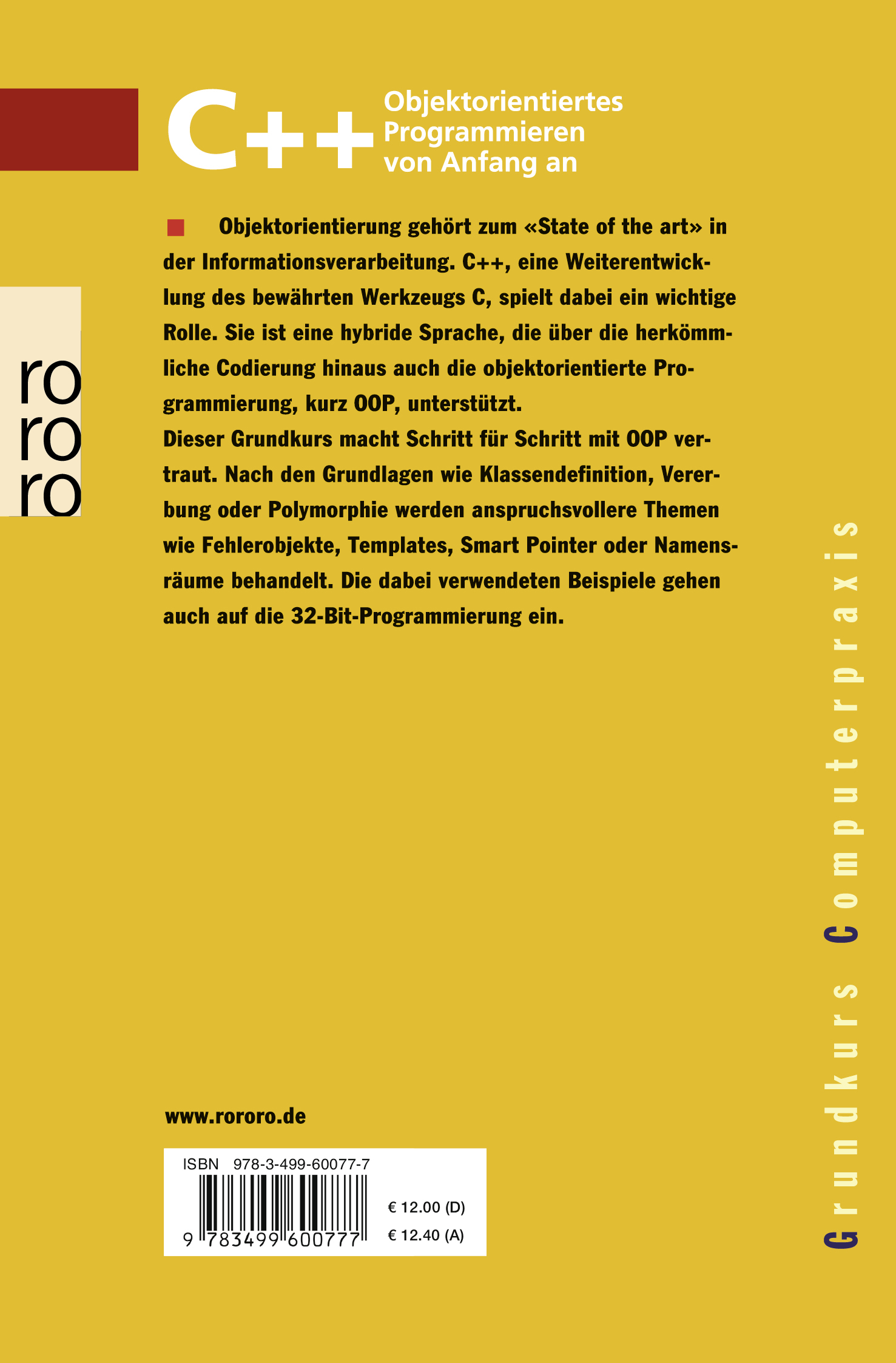 | Schlagworte | C++ (Programmiersprache); Einführung • EDV • Grundlagen • Informationsverarbeitung • Klassendefinition • Objektorientierte Programmierung • Objektorientierung • OOP • Polymorphie • Programmiersprache C • Programmierung • Templates • Weiterentwicklung |