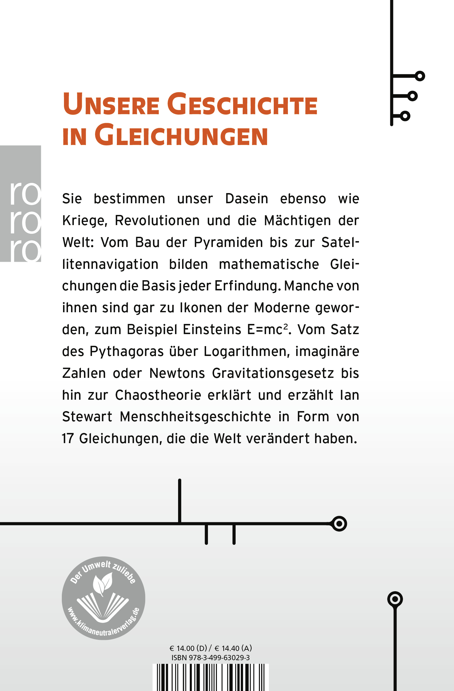 Sie bestimmen unser Dasein ebenso wie Kriege, Revolutionen und die Mächtigen der Welt: Vom Bau der Pyramiden bis zur Satellitennavigation bilden mathematische Gleichungen die Basis jeder Erfindung. Manche von ihnen sind gar zu Ikonen der Moderne geworden, zum Beispiel Einsteins E=mc2. Vom Satz des Pythagoras über Logarithmen, imaginäre Zahlen oder Newtons Gravitationsgesetz bis hin zur Chaostheorie erklärt und erzählt Ian Stewart Menschheitsgeschichte in Form von 17 Gleichungen, die die Welt verändert haben.