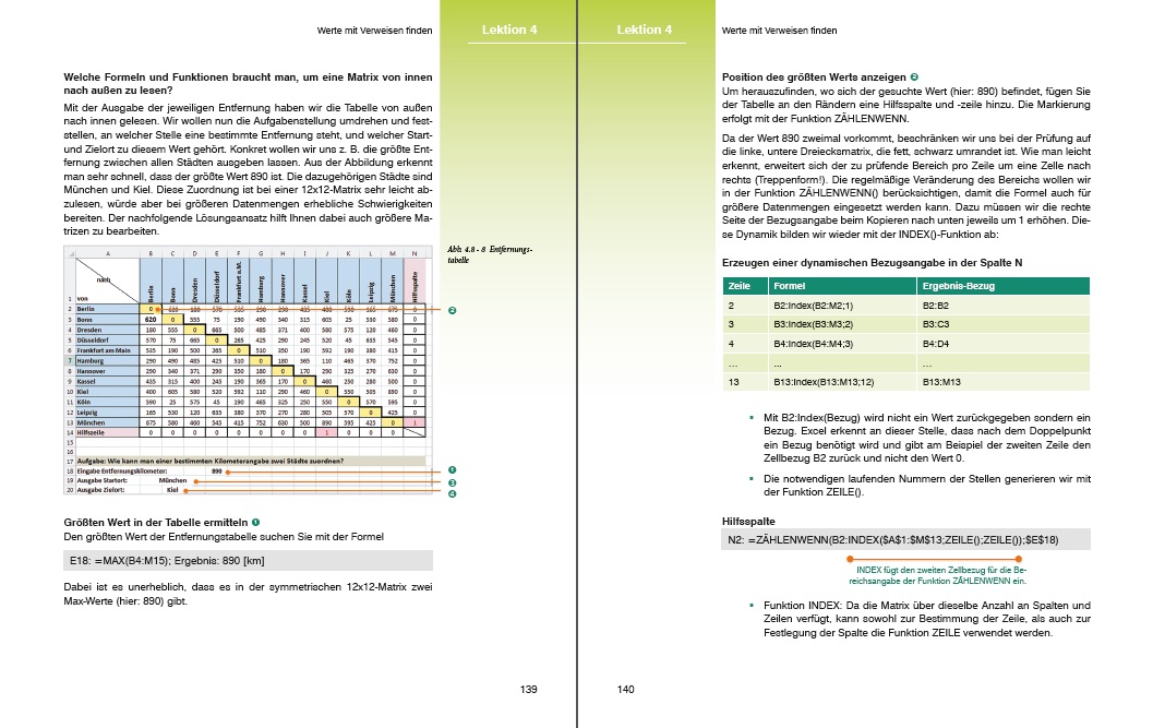 In diesem Buch werden in 7 Kapiteln die 110 wichtigsten Funktionen aus den Kategorien Datum, Zeit und Text, Mathe und Trigonometrie, Matrix, Logik und Statistik behandelt. Die Funktionen sind verpackt in über 80 Beispielen mit konkreten Problemstellungen aus den Bereichen Dienstleistung (Hotel Waldesruh) und Produktion ( Büromöbel AG ). Die Beispiele reichen vom einfachen Anwendungsfall bis zur komplexen Problemlösung, die sich über mehrere Seiten erstreckt. Letztere Lösungsansätze sind in kleine nachvollziehbare Schritte zerlegt und sind somit leicht verständlich und übertragbar. So lernen man u.a.