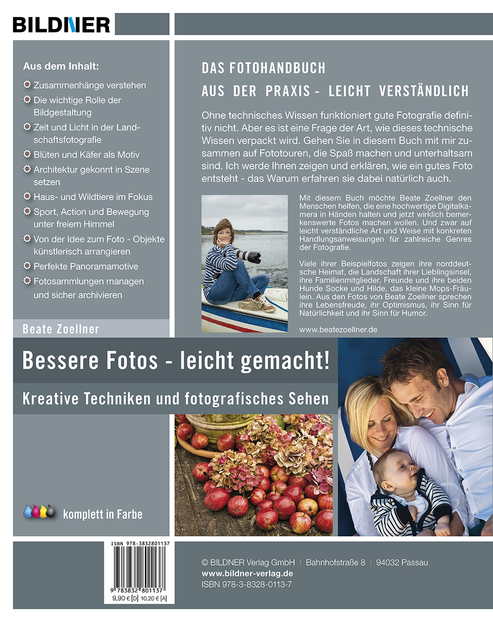 Mit diesem Buch möchte Beate Zoellner den Menschen helfen, die eine hochwertige Digitalkamera in Händen halten und jetzt wirklich bemerkenswerte Fotos machen wollen. Und zwar auf leicht verständliche Art und Weise mit konkreten Handlungsanweisungen für zahlreiche Genres der Fotografie. Viele ihrer Beispielfotos zeigen ihre norddeutsche Heimat, die Landschaft ihrer Lieblingsinsel, ihre Familienmitglieder, Freunde und ihre beiden Hunde Socke und Hilde, das kleine Mops-Fräulein. Aus den Fotos von Beate Zoellner sprechen ihre Lebensfreude, ihr Optimismus, ihr Sinn für Natürlichkeit und ihr Sinn für Humor.