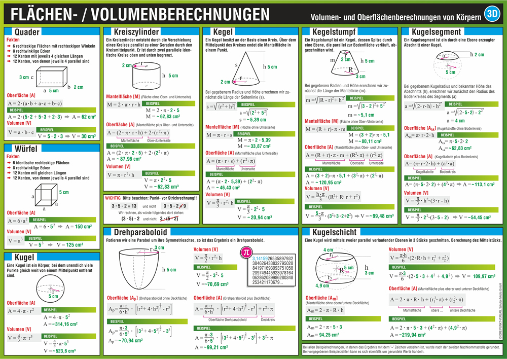 Flächen- und Volumenberechnungen können uns überall begegnen. Ob wir herausfinden wollen, wie viele Rolle Tapete wir benötigen oder ob wir das Volumen eines Tankinhalts auf einer Yacht berechnen müssen: Immer wieder treffen wir auf Formen, die schwieriger als ein normales Rechteck oder ein einfacher Quader geformt sind. Auf dieser Info-Tafel finden wir auf zwei Seiten alle wichtigen Berechnungsformeln inklusive Beispielaufgaben zur Berechnung von Umfang und Flächeninhalt bei ebenen Figuren sowie Volumen- und Oberflächenberechnungen dreidimensionaler Körper.Oberflächen- und Volumenberechnungen vom: - Quader- Würfel- Kugel- Kreiszylinder- Kegel- Drehparaboloid- Kegelstumpf- Kugelsegment- Kugelschicht- Umfangs- und Flächenberechnungen vom: - Rechteck- Parallelogramm- Dreieck (rechtwinklig, gleichschenklig, unregelmäßig)- Raute- Trapez- Kreis- Kreisausschnitt- Kreisabschnitt- EllipseWasserfest laminiert, hält die robuste Tafel dabei allen Bedingungen stand.
