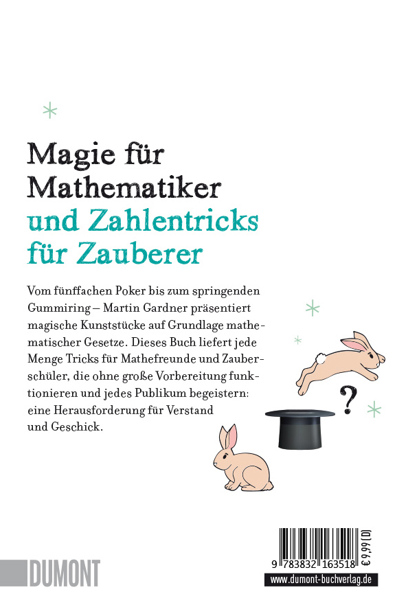 Martin Gardner ist nicht nur der Erfinder pfiffiger mathematischer Rätsel, sondern auch ein Meister magischer Kunststückchen und trickreicher Zaubereien. Von einfachen Kartentricks bis hin zu komplexen Weissagungen – hier kann man sich einiges abschauen und das stets auf Grundlage mathematischer Gesetze. Auf gewohnt unterhaltsame Weise beschreibt Gardner seine Tricks und lüftet so manches Geheimnis. Der Leser bekommt eine Einführung in die Magie – und lernt Mathe.